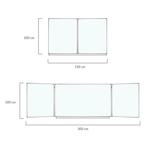 Состоит из 3-х элементов: центральная односторонняя секция – 100х150 см, двусторонние боковые секции – каждая по 100х75 см. Элементы крепления и полка для принадлежностей входят в комплект.