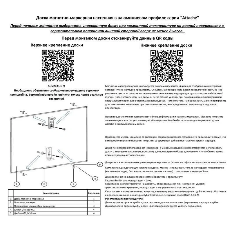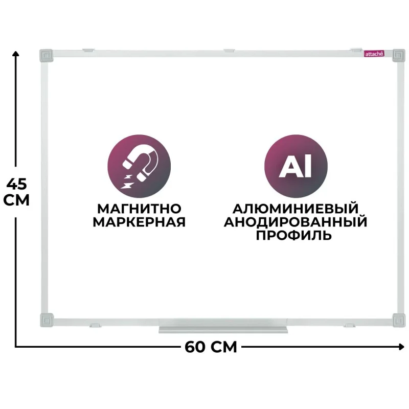 Классическая магнитно - маркерная доска Attache Classic, 45x60 см. Настенная односекционная белая, без линовки. В основании доски прочная сотовая панель из картона толщиной 9,5 мм. Толщина металла 0,3 мм. Размер рабочей поверхности: 43x58 см. Лаковое покрытие. Алюминиевая рама шириной (глубиной) 10 мм с прочными пластиковыми уголками. Магнитно-маркерная доска используется во время презентаций или для отображения материала, который нужно наглядно представить. Металлическая белая глянцевая поверхность позволяет крепить на доску важную информацию с помощью магнитов, использовать бумагу для заметок с клейким краем (стикеры) или писать специальными whiteboard маркерами сухого стирания, которые легко удаляются. Таким образом, на доске удобно размещать информацию, которая часто меняется. Эти доски используются для комфортной работы с информацией в организациях, учебных заведениях и домашних офисах. При удалении записей применяются только специальные губки-стиратели в комбинации со специализированным спреем для более тщательной очистки полотна. Для продления срока службы доски рекомендуется использовать фирменные маркеры и губки. Соблюдение правил ухода и эксплуатации способно обеспечить срок службы рабочей поверхности магнитно-маркерной доски более 10 лет. В комплекте съемная полка для маркеров, набор для навесного крепления, инструкция по установке. Расположение горизонтальное/ вертикальное. Страна-производитель - Россия. Поставляется готовой для использования. Не требует дополнительных манипуляций по отделению защитных слоев с пишущих поверхностей. Возможно изготовление на заказ по Вашим размерам. Законодательные и технические документы