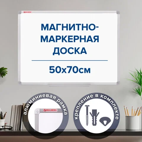 Доска магнитно-маркерная 70х50 см, алюминиевая рамка, ГАРАНТИЯ 10 ЛЕТ, РОССИЯ, BRAUBERG, 238185