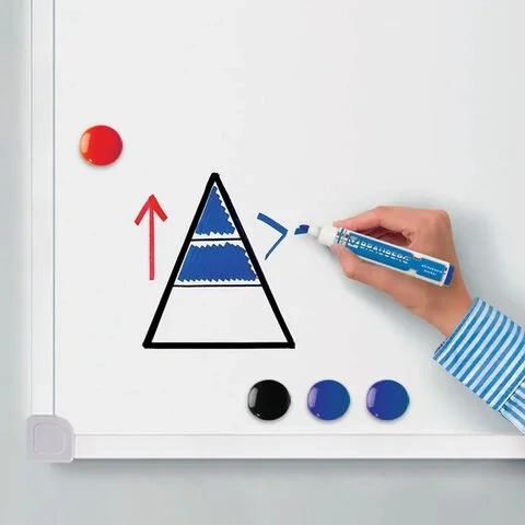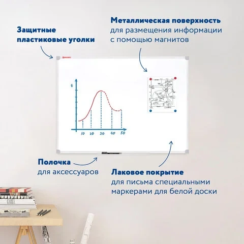 Лаковое покрытие предназначено для письма специальными маркерами для белой доски, а металлическая поверхность позволяет размещать информацию при помощи магнитов. Доска размером 70х50 см имеет укрепленные пластиковые уголки, которые позволяют скрыть места крепления к стене. Профиль доски выполнен из ПВХ белого цвета. Полочка для аксессуаров и элементы крепления входят в комплект. При должном уходе за рабочей поверхностью доски при помощи чистящей жидкости-спрея и стирателей BRAUBERG поверхность магнитно-маркерной доски прослужит более 10 лет.