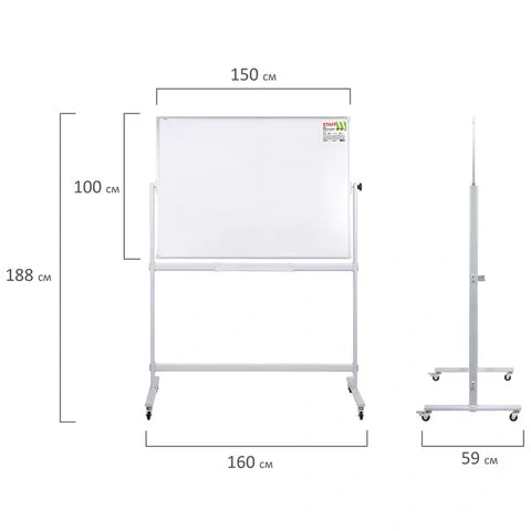 Лаковое покрытие предназначено для письма специальными маркерами для белой доски. Металлическая поверхность позволяет размещать информацию при помощи магнитов. Вращается в горизонтальной плоскости на 360 градусов. Перемещается на колесиках. Элементы крепления и лоток для принадлежностей входят в комплект. Размер доски: 100х150 см. Перед началом работы необходимо удалить защитную пленку с рабочей поверхности доски.
