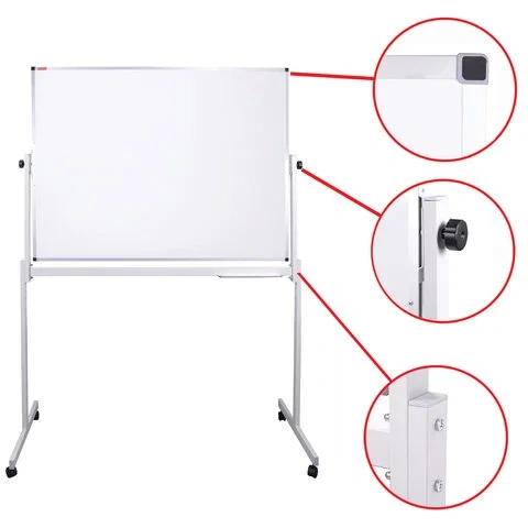 Лаковое покрытие предназначено для письма специальными маркерами для белой доски, а металлическая поверхность позволяет размещать информацию при помощи магнитов. Вращается в горизонтальной плоскости на 360°. Перемещается на колесиках. Алюминиевая рама придает доске необходимую прочность. Подставка для канцелярских принадлежностей позволяет всегда держать под рукой магниты, маркеры, стиратели и другие необходимые предметы. Элементы крепления входят в комплект. Защитная пленка предупреждает появление царапин, потертостей и сколов на рабочей поверхности доски при транспортировке и хранении продукции (перед началом работы необходимо удалить защитную плёнку). Размер: 90х120 см.