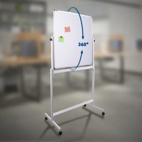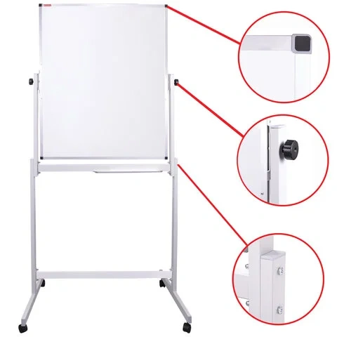 Лаковое покрытие предназначено для письма специальными маркерами для белой доски, а металлическая поверхность позволяет размещать информацию при помощи магнитов. Вращается в горизонтальной плоскости на 360°. Перемещается на колесиках. Алюминиевая рама придает доске необходимую прочность. Подставка для канцелярских принадлежностей позволяет всегда держать под рукой магниты, маркеры, стиратели и другие необходимые предметы. Элементы крепления входят в комплект. Защитная пленка предупреждает появление царапин, потертостей и сколов на рабочей поверхности доски при транспортировке и хранении продукции (перед началом работы необходимо удалить защитную плёнку). Размер: 60х90 см.