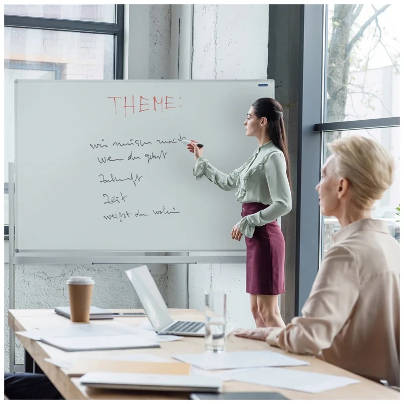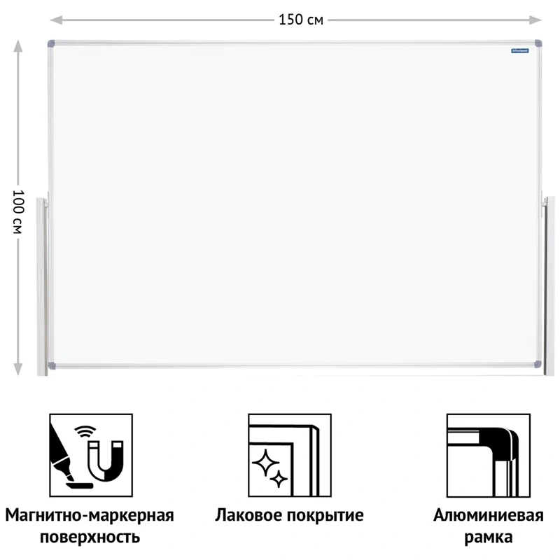 Доска магнитно-маркерная OfficeSpace с алюминиевым профилем. Размер: 1000*1500 мм. Доска двусторонняя, поворотная, мобильная, с фиксацией положения. Идеально подходит для проведения планёрок, совещаний и презентаций.