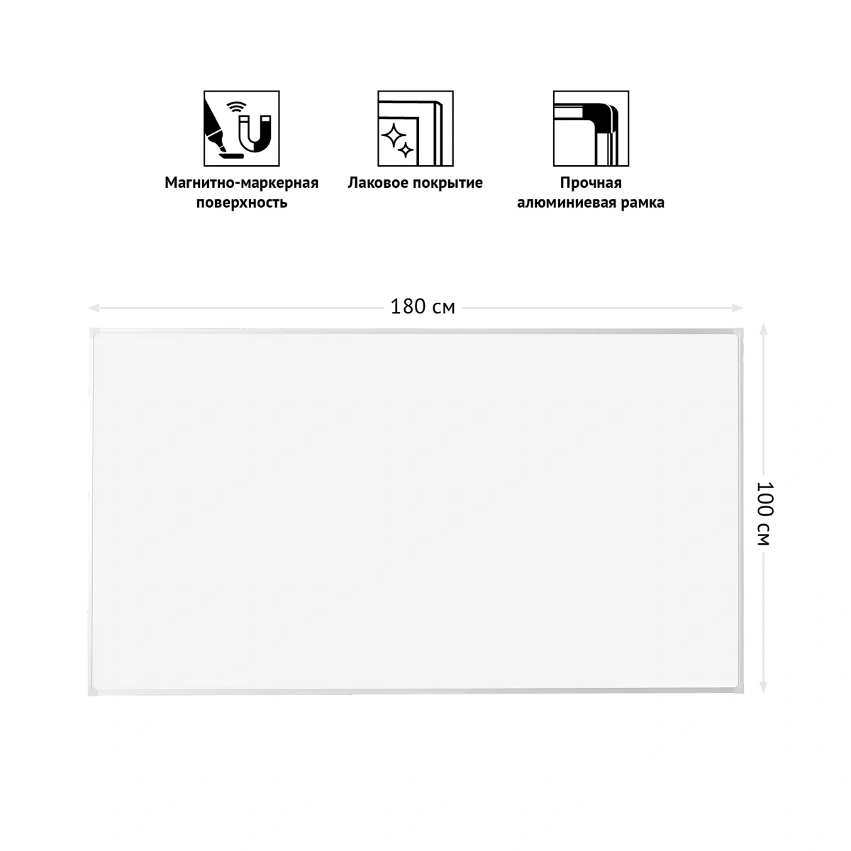 Доска магнитно-маркерная OfficeSpace в размере 100*180 см – отличное приобретение для офиса или школы, идеально подойдет для проведения тренингов, совещаний и презентаций. Вес нетто составляет 7,4 кг. Лакированная поверхность белого цвета подходит для письма сухостираемыми маркерами. Можно прикреплять информацию с помощью магнитов или немагнитной поверхности (меламин). В комплект входит полочка. Рамка доски – алюминиевый профиль шириной (видимая часть) 17мм и глубиной 6мм. Односторонняя доска представлена со скрытым креплением к стене в четырех углах, крепежные элементы и инструкция прилагаются.