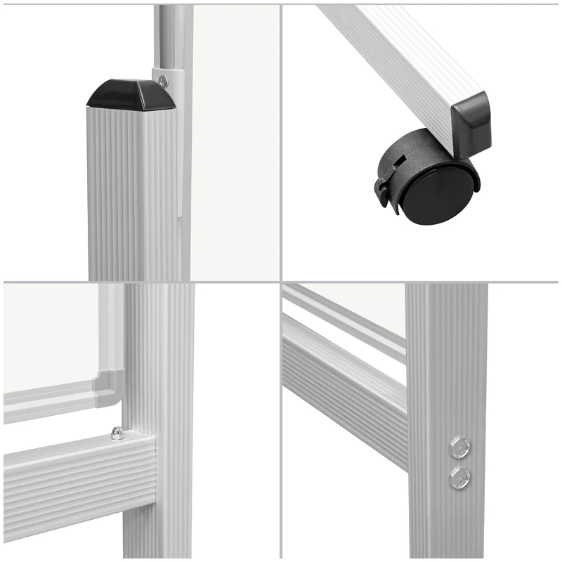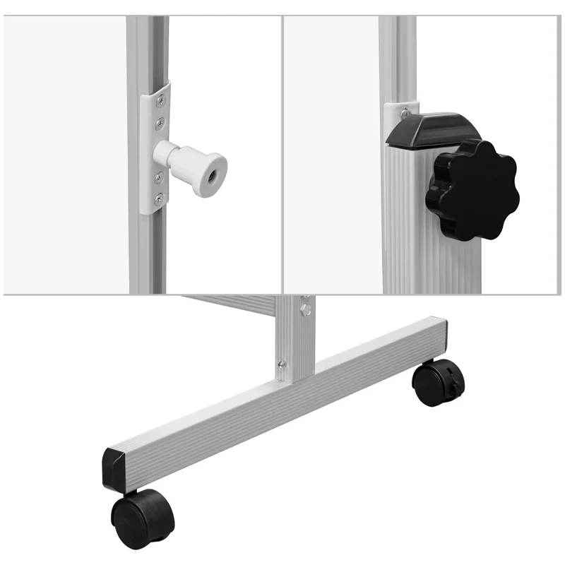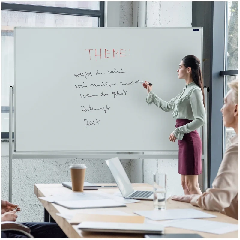 Мобильная магнитно-маркерная доска идеально подойдет для проведения тренингов, совещаний и презентаций. Информация может наноситься на обе стороны доски, которая вращается в горизонтальной плоскости на 360 градусов и фиксируется в любом положении. Белое лаковое покрытие предназначено для письма специальными маркерами для белой доски. Металлическая поверхность также позволяет размещать объявления при помощи магнитов. Алюминиевая рамка с укрепленными пластиковыми уголками гарантирует прочность конструкции и длительный срок службы. Стенд на колесах позволяет при необходимости легко перемещать доску. Комплектация - полочка для аксессуаров, инструкция.