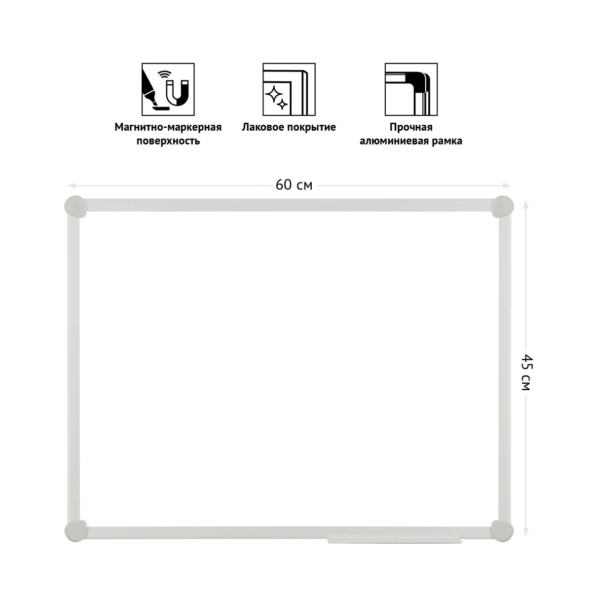 Доска магнитно-маркерная OfficeSpace в размере 45*60 см – отличное приобретение для офиса или школы. Вес нетто составляет 1,3 кг. Лакированная поверхность белого цвета подходит для письма сухостираемыми маркерами. Можно прикреплять информацию с помощью магнитов. В комплект входит полка для маркеров 30 см. Рамка доски – алюминиевый профиль шириной (видимая часть) 17мм и глубиной 6мм. Односторонняя доска представлена со скрытым креплением к стене в четырех углах, крепежные элементы прилагаются.