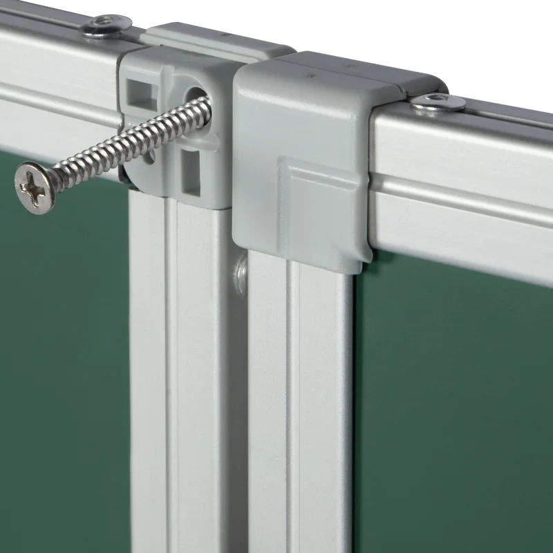 Рама доски изготовлена из алюминиевого анодированного профиля, скрепленного пластиковыми уголками. Обратная сторона створок выполнена в зеленом цвете. Предназначена для нанесения информации цветным мелом. Поверхность доски также позволяет прикреплять листы бумаги, карты и другие материалы с помощью магнитов. Скрытое крепление к стене осуществляется в четырех точках (центральная секция).