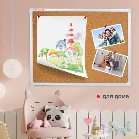 Поверхность изготовлена из натуральной пробки. Имеет улучшенную алюминиевую рамку и укрепленные пластиковые уголки. Размер доски - 60х90х1,5 см. Цвет покрытия: коричневый. Возможность горизонтального и вертикального размещения доски. Крепится к стене, элементы крепления входят в комплект.