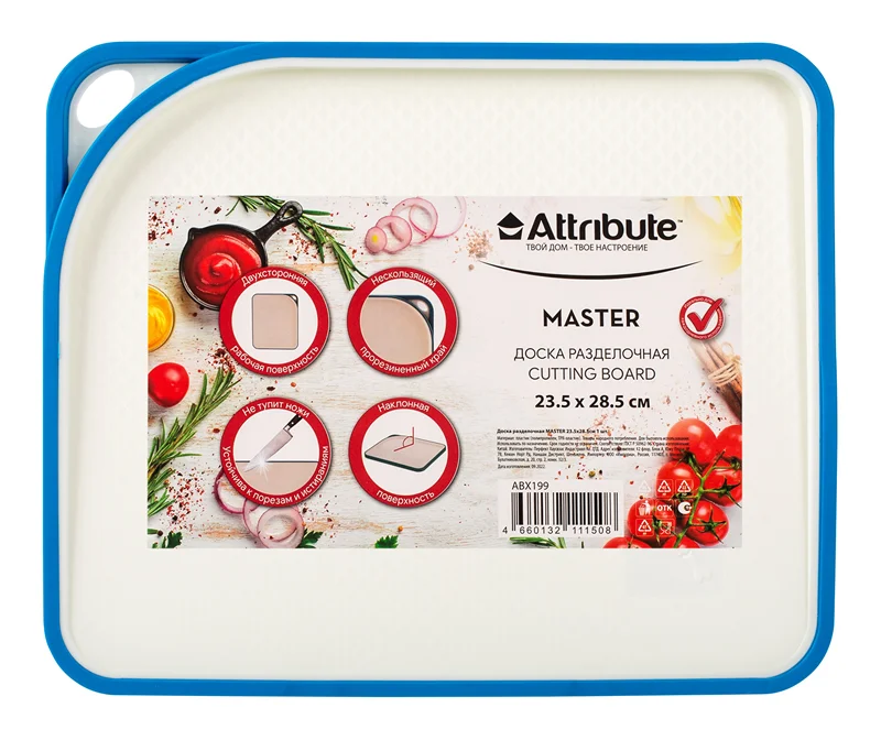 Доска разделочная Attribute Master, 28,5 x 23,5 см обладает противоскользящим покрытием. Лезвие ножа отлично пружинит и не тупится. Доска предназначена для нарезки овощей, фруктов, хлеба, мяса, колбасных и сырных изделий. Материал не впитывает запахи, не вступает в реакцию с пищей, легко моется с помощью воды и губки. Доска прочная, износостойкая, не боится падений и ударов. Изделие легко очищается под проточной водой с помощью средства для мытья посуды и губки.