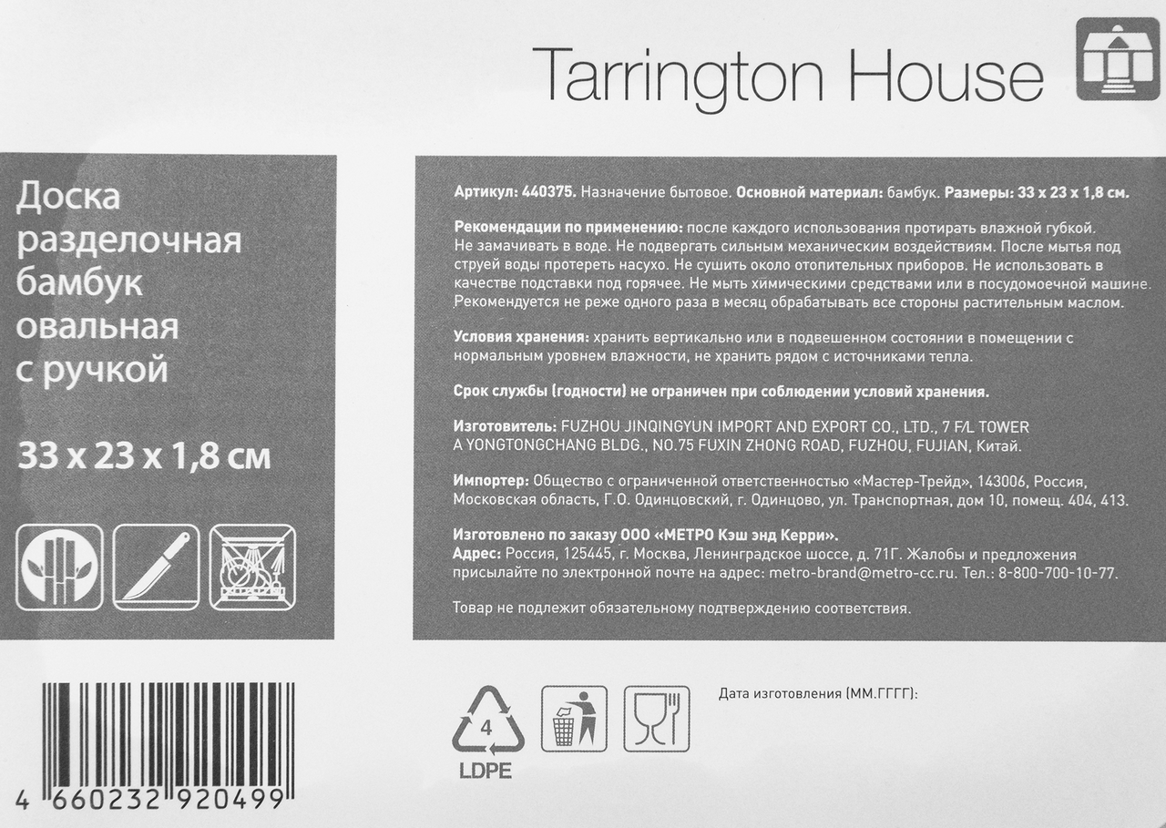 Tarrington House Доска разделочная с ручкой, 33 х 23 x 1,8 см изготовлена из натурального бамбука. Это очень прочный, но легкий материал, который великолепно подходит для производства кухонной утвари. На бамбуковой доске можно нарезать абсолютно любые продукты: мясо, рыбу, птицу, овощи. По своим техническим характеристикам она значительно превосходит деревянные и пластиковые аналоги. Прочная и долговечная раздел??чная доска из бамбука с удобной ручкой имеет множество преимуществ. Экологически чистый материал устойчив к перепадам температур, изделие можно использовать не только для нарезания продуктов, но и в качестве подставки под горячее или как поднос для заморозки полуфабрикатов. Отличается высокой прочностью и устойчивостью к механическим повреждениям, не тупит ножи в процессе использования. Даже при продолжительной эксплуатации не теряет первоначальной формы и остается идеально ровной, не деформируется, не изгибается, не выкручивается из-за регулярного контакта с водой. Специальный желобок по краям не позволяет соку от продуктов стекать на столешницу. Кроме того, разделочная доска из бамбука не впитывает запахи ингредиентов, которые на ней наре??аются, а также совершенно неприхотлива в уходе. После использования достаточно вымыть изделие обычной водой с моющим средством.