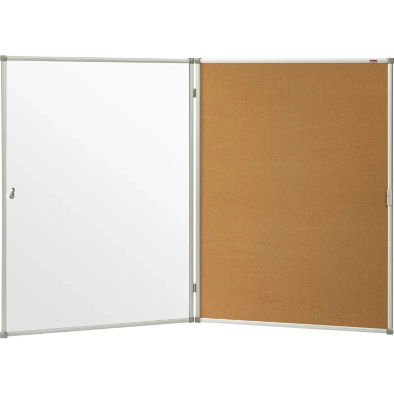 Пробковая доска витрина на замке. Размер 90x120 см. Для размещения информации с помощью силовых кнопок и булавок. Рамка доски и дверцы из алюминия, материал дверцы — оргстекло. Замок врезной, поворотного действия с индивидуальными ключами. Монтажный крепеж и 2 ключа в комплекте.