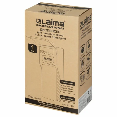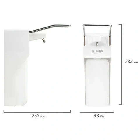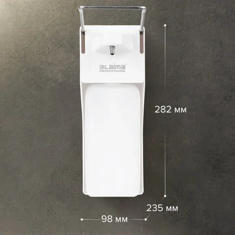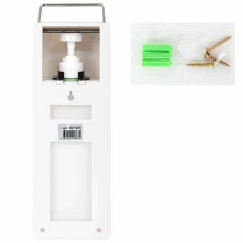 Антивандальный наливной дозатор из ABS-пластика объемом 1 л обеспечивает высокую гигиеничность. Механизм дозирования при помощи локтевого привода позволяет избежать контакта рук с поверхностью диспенсера. Выдача мыла/антисептика осуществляется экономичными порциями. Диспенсер сочетается с расходными материалами других производителей. В комплект входят еврофлакон и крепежные элементы.