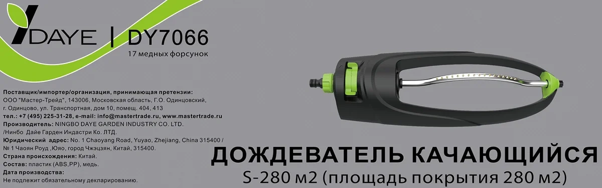 Дождеватель качающийся, S-280 м2. Изготовлен из РР - полипропилен + АБС-пластик - ударопрочная техническая термопластическая смола на основе сополимера акрилонитрила с бутадиеном и стиролом, медь.
