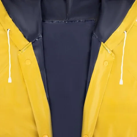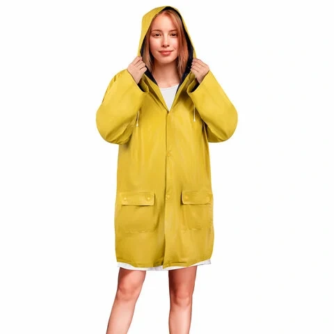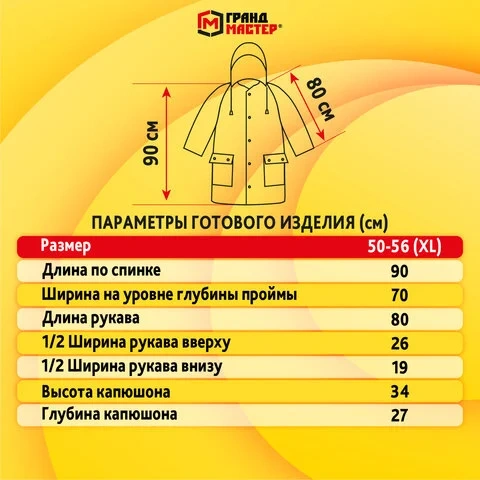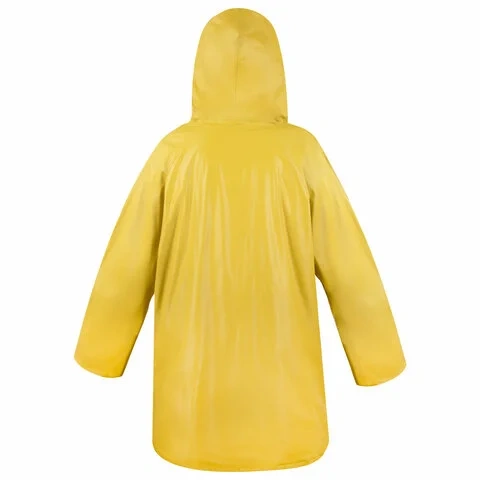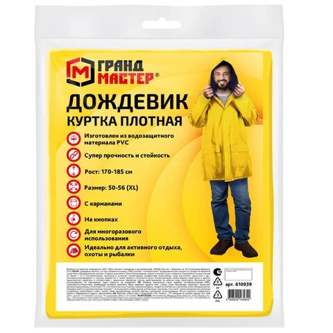 Дождевик-куртка универсального размера с капюшоном изготовлена из плотного водозащитного материала – поливинилхлорида (PVC). Застегивается на 4 пары кнопок из полипропилена (PP). В капюшоне есть кулиска с пластиковыми наконечниками. Карманы с влагозащитными клапанами на кнопках. Рукава сужаются книзу. Края рукавов, полочек и низ изделия подогнуты и надежно проклеены. Супер-прочный и стойкий материал. Для многоразового использования.