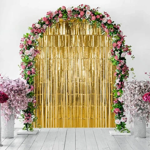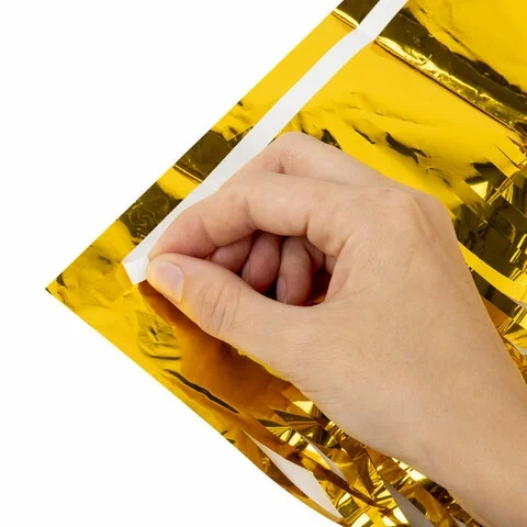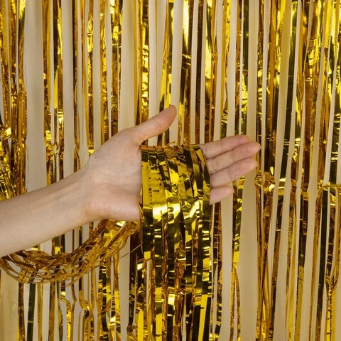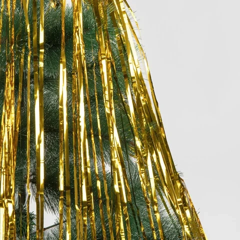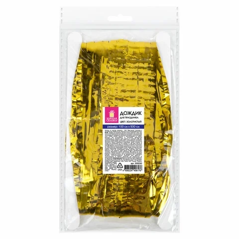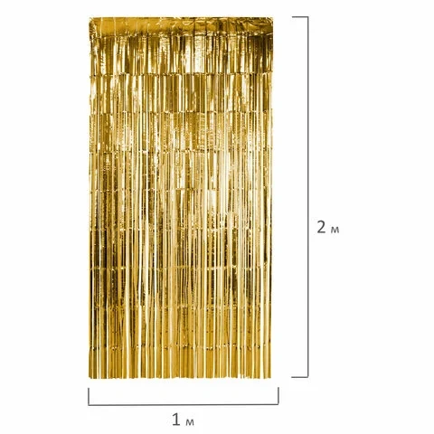 Высота занавеса в расправленном и подвешенном виде составляет 2 метра, ширина – 1 метр. Материал дождика – полиэтилентерефталат. Цвет - золотистый.