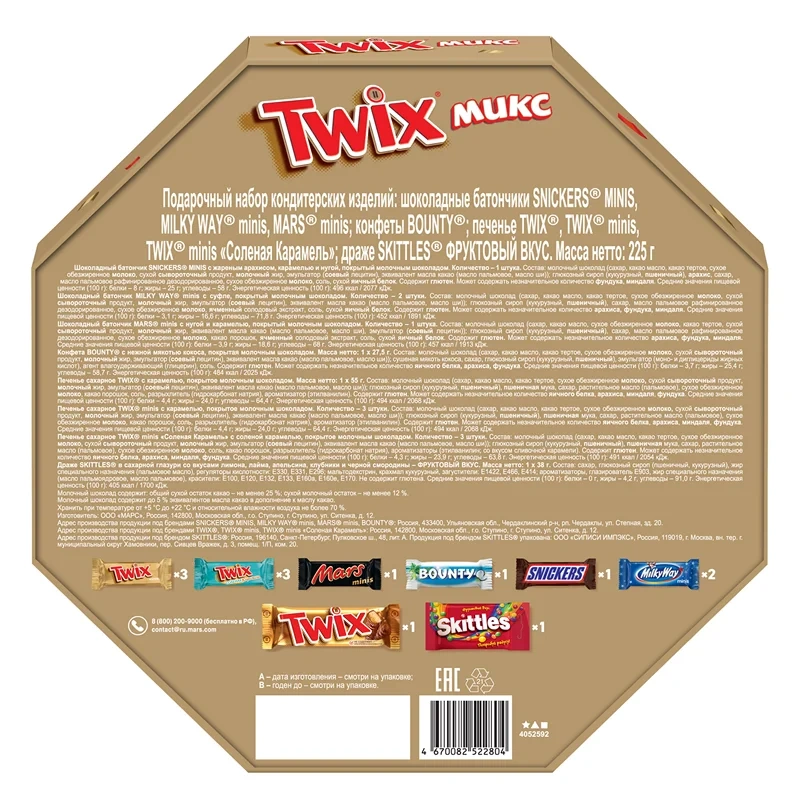 Молочный шоколад, натуральные ингредиенты: сахар, сухое цельное молоко, какао–масло, какао-масса, эмульгатор: соевый лецитин, натуральный ароматизатор ванили; Глазурь: арабская камедь, шеллак; Начинка: жареный арахис, мед, сахар, темный шоколад, яичный белок в порошке, кукурузный крахмал, натуральный ароматизатор ванили, рисовый крахмал.