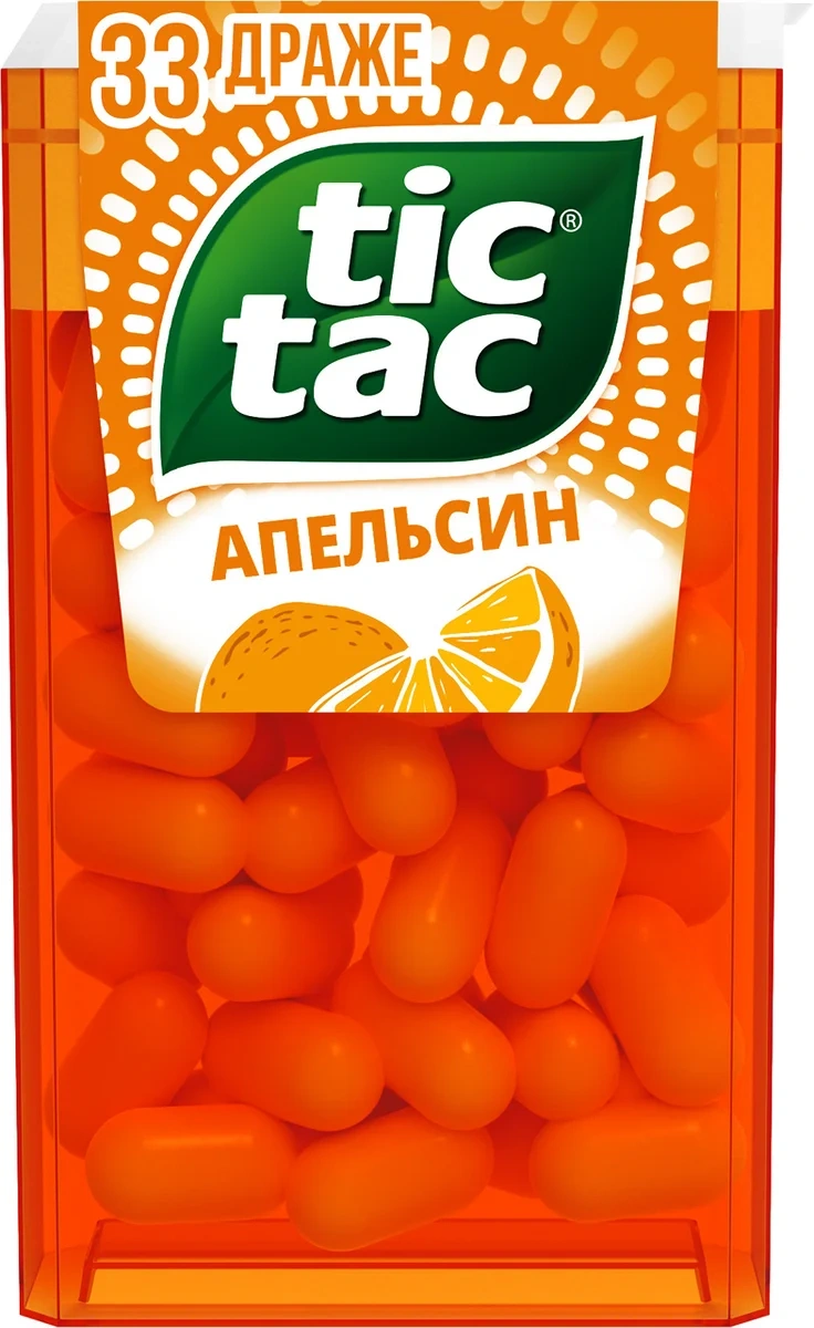 Драже Tic Tac со вкусом апельсина, 16 г – вкусное, освежающее драже, которое поможет взбодриться во время прогулки, дальней поездки или на работе. В его основе лежит сахар, регуляторы кислотности, фруктоза, ароматизаторы, эфирные масла и ряд других ингредиентов. ГМО в составе отсутствует. Под тонкой оболочкой сокрыт уникальный вкус и источник мощной свежести. Продукт характеризуется высокой энергетической ценностью. Он выпускается в плотной пластиковой коробке, которую удобно брать всегда с собой – ее можно положить в сумку или карман одежды.