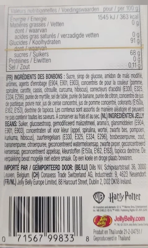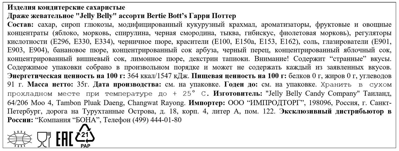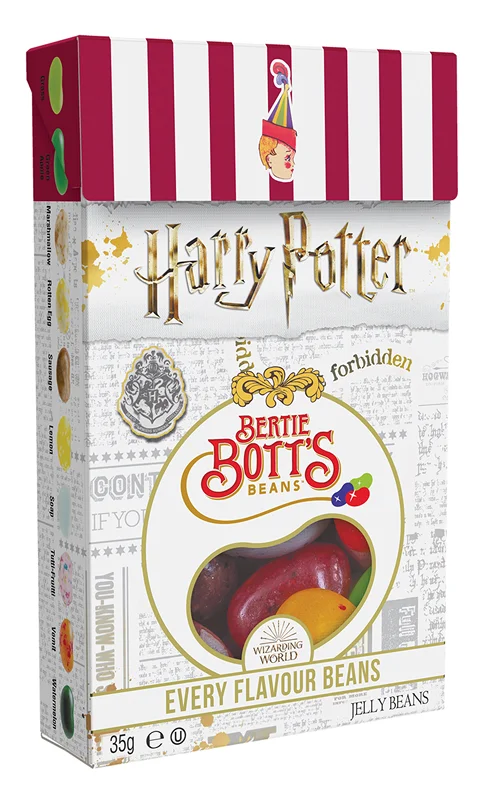 Напомним вам предысторию конфет Harry Potter Bertie Bott's. Нищий кондитер Берти Бот экспериментировал с новыми видами сладостей в попытке создать прорывной товар. В процессе в котел случайно попал грязный носок самого Берти. Отведав результат своего труда, он вначале пришел в ужас от мерзости, которая у него получилась, а потом смекнул - неприятность можно использовать. Таких сладостей не делает никто. Интуиция не подвела Берти Бота. На волне успеха он выпустил бесконечное количество странных вкусов. В ход шла всякая ерунда: продукты из холодильника, отходы и даже, как это противно не звучит; отходы жизнедеятельности человека. Ух, какая гадость! Так откуда у названия конфет-бобов появилась приставка - Гарри Поттер? Все просто! Присутствие конфет Garry Potter Bertie Botts Beans прослеживается через все серии романов про приключения молодого волшебника. Они настолько гармонично вписаны в знаменитую сагу, что если создатель истории, Джоан Роулинг, уберет упоминания бобов, то кажется, характер главного героя, потеряет такую необыкновенно привлекательную изюминку. Возникает вопрос. В чем же отличие конфет Гарри Поттера Bertie Botts Beans 34 гр. от таких же в мягкой пачке 54 гр? Неужели только в размере и упаковке? Секрет знают единицы знатоков. Мы тоже поделимся им с Вами. Оказывается, в коробочке 34 гр. присутствует конфетка зефир (маршмеллоу в западном варианте названия), а в упаковке 54 гр - маршмеллоу гриль. Известно, что в США так называемый маршмеллоу употребляют в пищу как сладкий десерт исключительно на природе, а именно - поджаривают его на костре. Другими словами, делают гриль. Вкус отличается явным присутствием дымка во вкусе.
