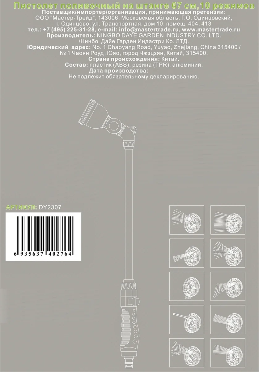 Пистолет поливочный на штанге 67 см, 10 режимов изготовлен из АБС-пластик - ударопрочная техническая термопластическая смола на основе сополимера акрилонитрила с бутадиеном и стиролом + TPR или термопластичная резина, алюминий.