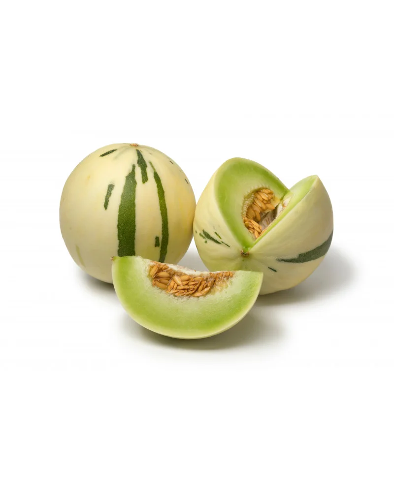 Дыня Дино из Бразилии - сочная, сладкая и освежающая дыня с нотками цветочного меда. Плод отличается небольшим размером и округлой формой, мякоть плотная и ароматная с кремово-белым оттенком.