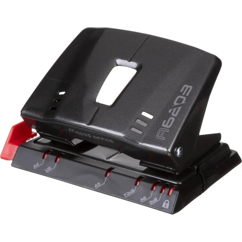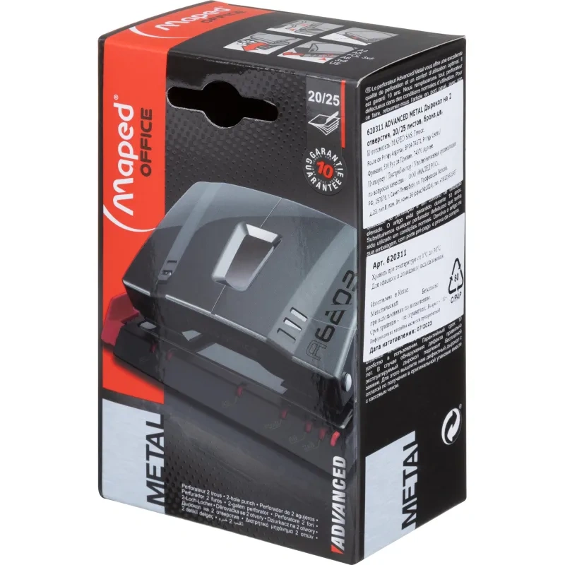 Дырокол Maped Advanced Metal, металлический, эргономичный. На2отверстия.100% металлический механизм. Фронтальный отсек для конфетти. Направляющая линейка для бумаг различных форматов. Пробивание отверстий без направляющих: запатентованная система пробивания отверстий спомощью колец регистратора. Количество пробиваемых листов- 20(плотность бумаги 80гр/кв.м) или25 (плотность бумаги 70гр/кв.м). Быстрое иточное пробивание благодаря центровочным меткам. Размеры (ДхШхВ): 122x47x83мм. Вес 280грамм. Цвет темно-серый. Гарантия 10лет.