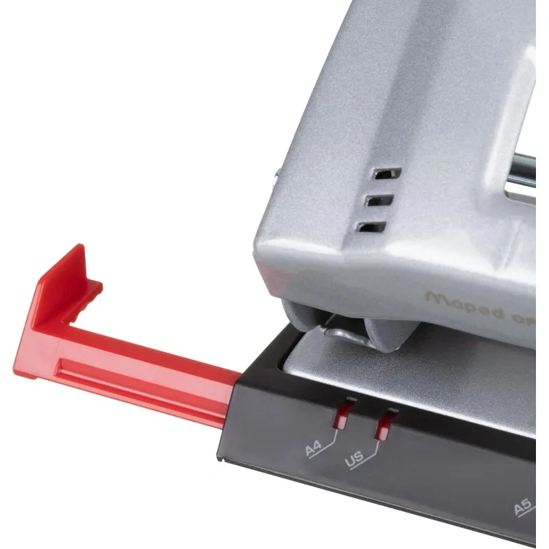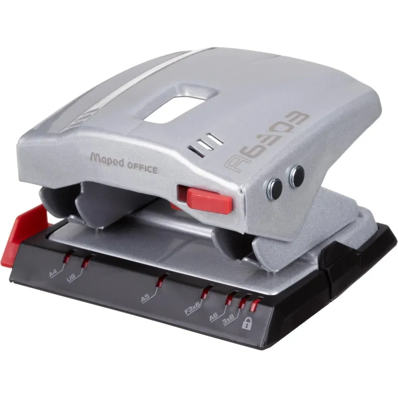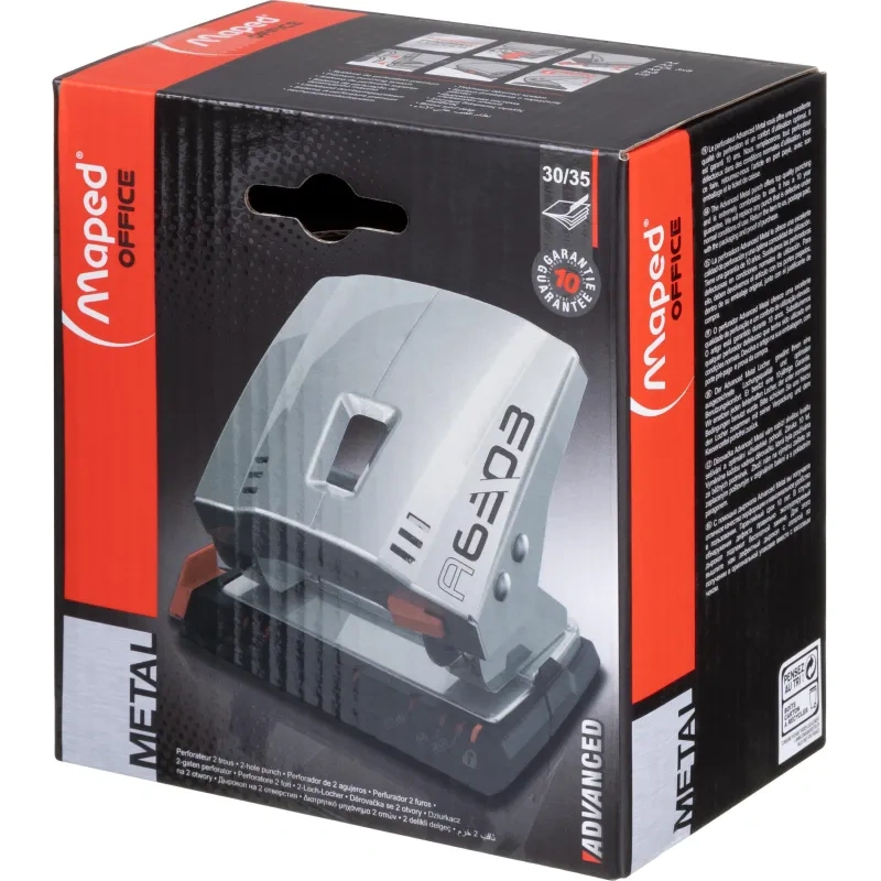 Дырокол Maped Advanced Metal, металлический, эргономичный. На2отверстия.100% металлический механизм. Фронтальный отсек для конфетти. Направляющая линейка для бумаг различных форматов. Пробивание отверстий без направляющих: запатентованная система пробивания отверстий спомощью колец регистратора. Количество пробиваемых листов- 30(плотность бумаги 80гр/кв.м) или35 (плотность бумаги 70гр/кв.м). Быстрое иточное пробивание благодаря центровочным меткам. Фиксация всложенном положении. Размеры (ДхШхВ): 127x76x111мм. Вес 512грамм. Цвет серебристый. Гарантия 10лет.