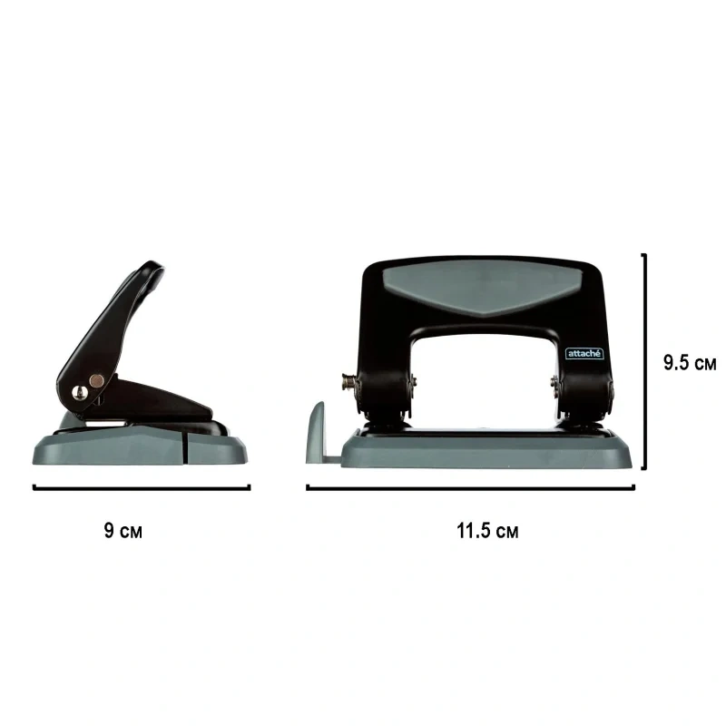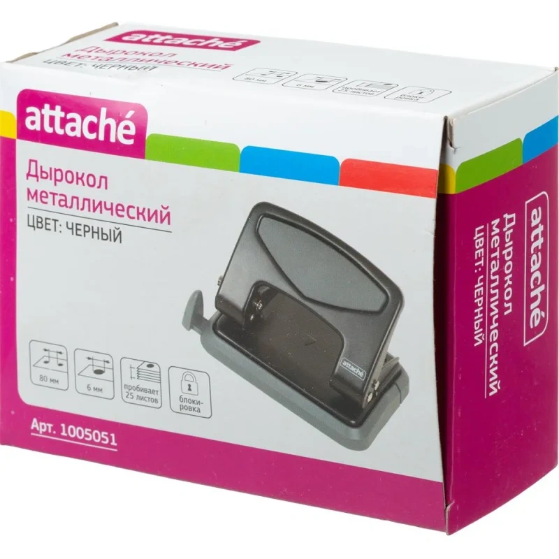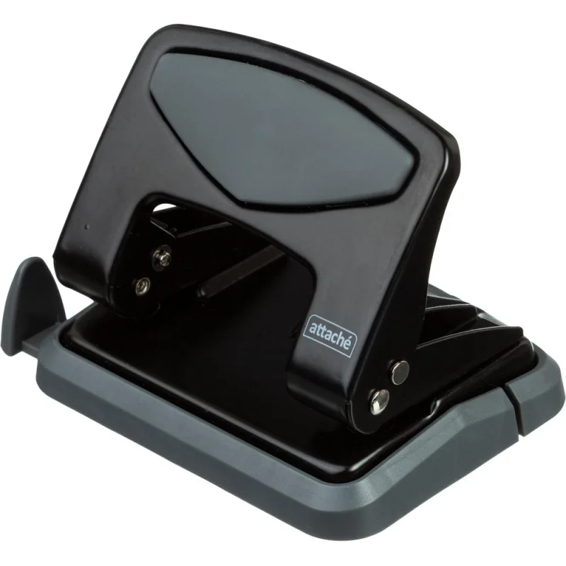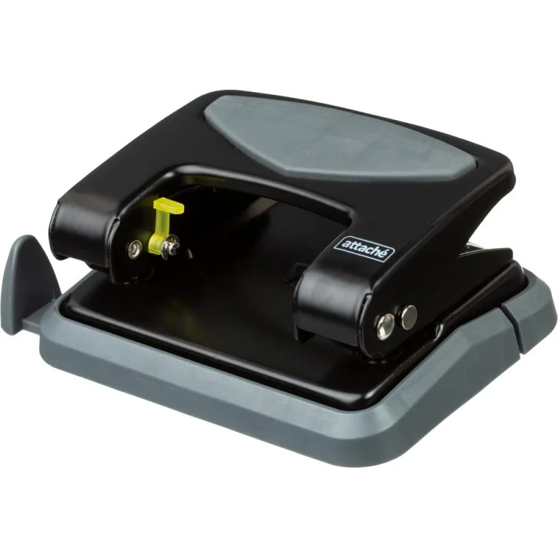 Дырокол Attache — это важный и необходимый предмет для комфортной работы в офисе и дома. Дырокол позволяет аккуратно перфорировать документы, чтобы подшить их в папку с двумя и четырьмя кольцами или в скоросшиватель. Современный дизайн и универсальный черный цет металлического корпуса отлично впишутся в любой офисный интерьер. Специальная резиновая вставка на корпусе не позволяет рукам скользить во время работы. Одним нажатием возможно пробить отверстия в документе толщиной до 25 листов плотностью 80 г/кв.м. Дырокол делает два отверстия диаметром 6 мм, расстояние между отверстиями — 80 мм. Пробойники дырокола изготовлены из высококачественного металла, что позволит им прослужить дыроколу долго и без сложностей пробивать листы бумаги. Удобный контейнер для конфетти легко открывается и закрывается, исключая его рассыпание. Наличие линейки с делениями позволяет зафиксировать бумагу на нужном расстоянии и пробить отвестия в бумаге в соответствии с ее размером. Удобно работать с форматами A3, A4, A5, A6, B4, B5, B6. Отметка на линейке 888 позволяет использовать также как дырокол на 4 отверстия. Дырокол имеет кнопку фиксации в закрытом виде, что позволяет экономить рабочего пространство.