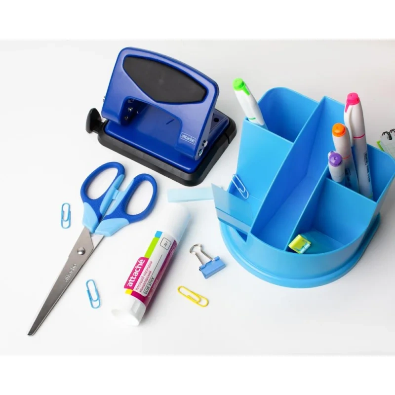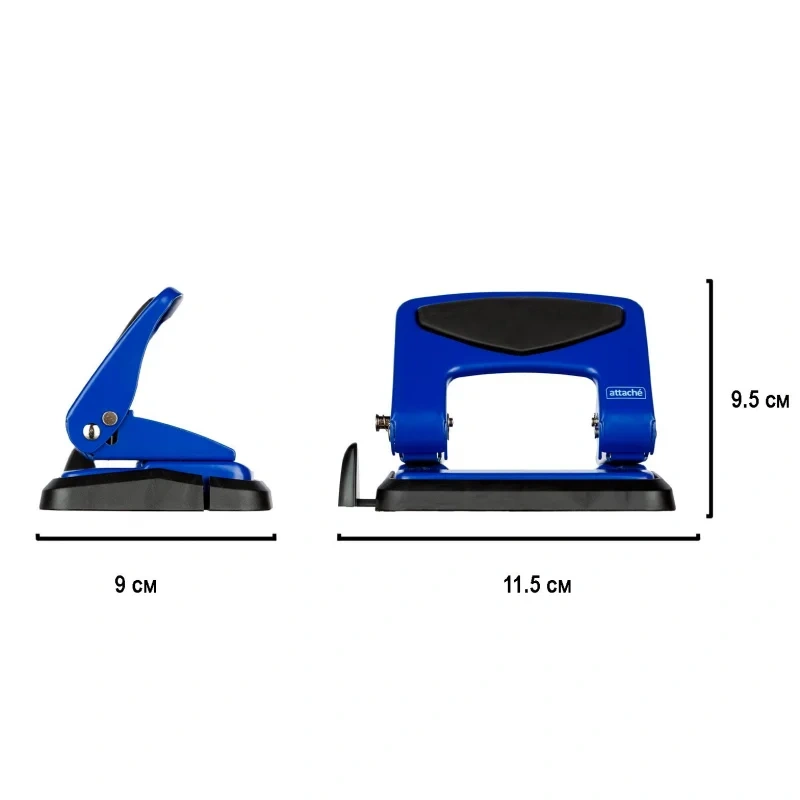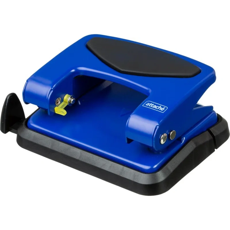 Дырокол Attache — это важный и необходимый предмет для комфортной работы в офисе и дома. Дырокол позволяет аккуратно перфорировать документы, чтобы подшить их в папку с двумя и четырьмя кольцами или в скоросшиватель. Современный дизайн и синий цвет металлического корпуса отлично впишутся в офисный интерьер. Специальная резиновая вставка на корпусе не позволяет рукам скользить во время работы. Одним нажатием возможно пробить отверстия в документе толщиной до 25 листов плотностью 80 г/кв.м. Дырокол делает два отверстия диаметром 6 мм, расстояние между отверстиями — 80 мм. Пробойники дырокола изготовлены из высококачественного металла, что позволит им прослужить дыроколу долго и без сложностей пробивать листы бумаги. Удобный контейнер для конфетти легко открывается и закрывается, исключая его рассыпание. Наличие линейки с делениями позволяет зафиксировать бумагу на нужном расстоянии и пробить отвестия в бумаге в соответствии с ее размером. Удобно работать с форматами A3, A4, A5, A6, B4, B5, B6. Отметка на линейке 888 позволяет производить 4 отверстия. Дырокол имеет кнопку фиксации в закрытом виде, что позволяет экономить рабочего пространство. Имеет метку центрирования.