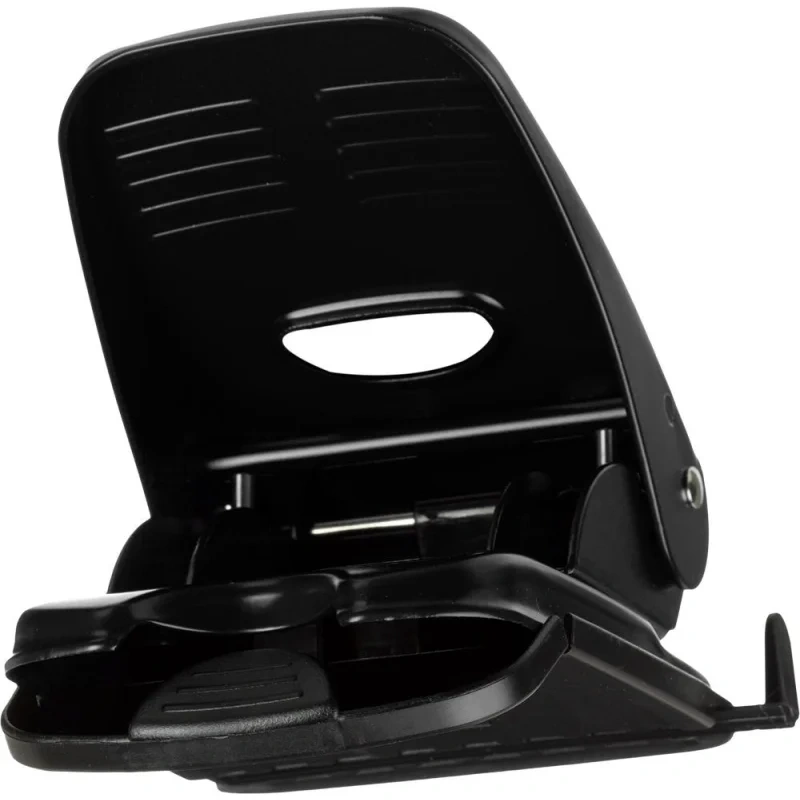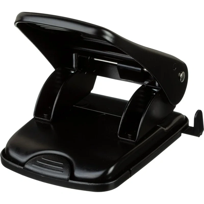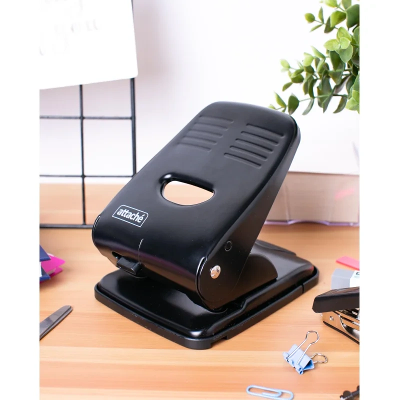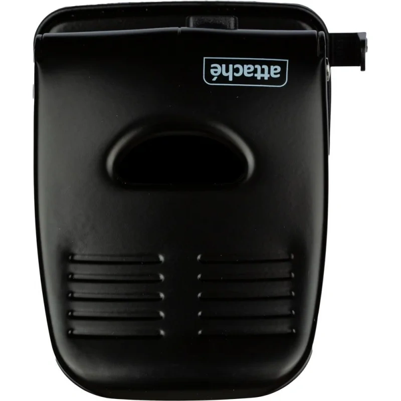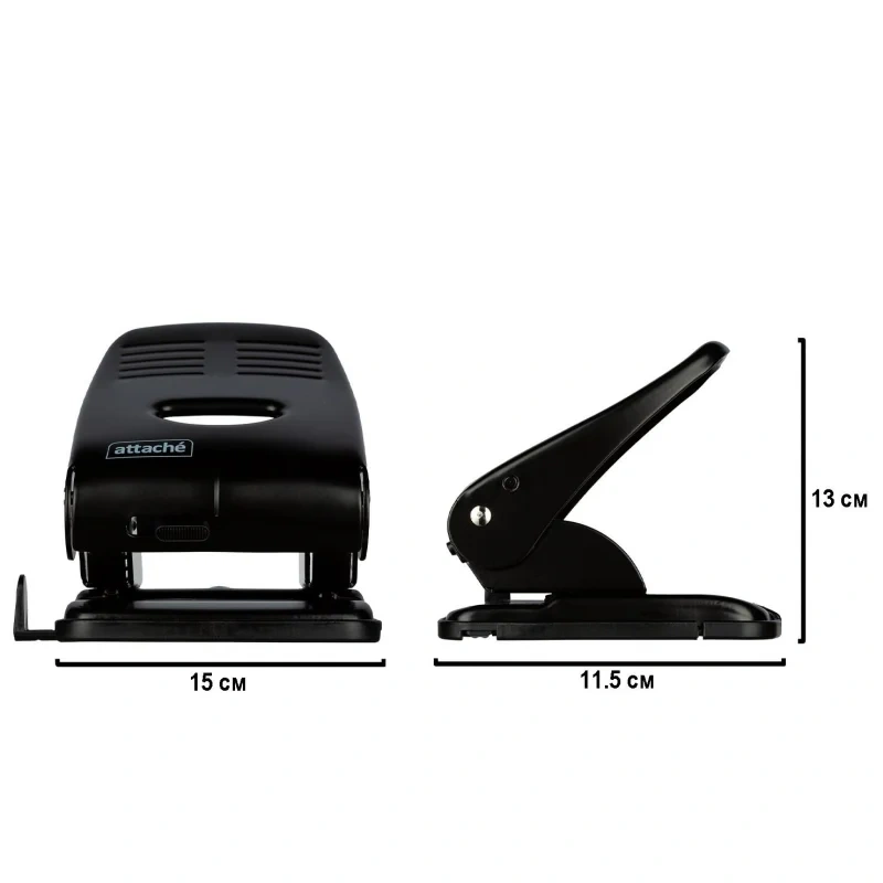 Дырокол Attache — это важный и необходимый предмет для комфортной работы в офисе и дома. Дырокол позволяет аккуратно перфорировать документы, чтобы подшить их в папку с двумя и четырьмя кольцами или в скоросшиватель. Классический дизайн и черный цвет металлического корпуса отлично впишутся в офисный интерьер. Текстурная поверхность специальной вставки на корпусе не позволяют рукам скользить во время работы. Одним нажатием возможно пробить отверстия в документе толщиной до 40 листов плотностью 80 г/кв.м. Дырокол делает два отверстия диаметром 5.5 мм, расстояние между отверстиями — 80 мм. Пробойники дырокола изготовлены из высококачественного металла, что позволит им прослужить дыроколу долго и без сложностей пробивать листы бумаги. Удобный контейнер для конфетти легко открывается и закрывается, исключая его рассыпание. Наличие линейки с делениями позволяет зафиксировать бумагу на нужном расстоянии и пробить отвестия в бумаге в соответствии с ее размером. Удобно работать с форматами А4, А5, А6. Имеет метку центрирования.