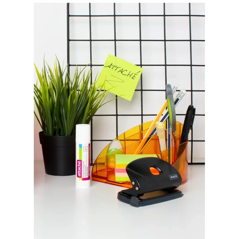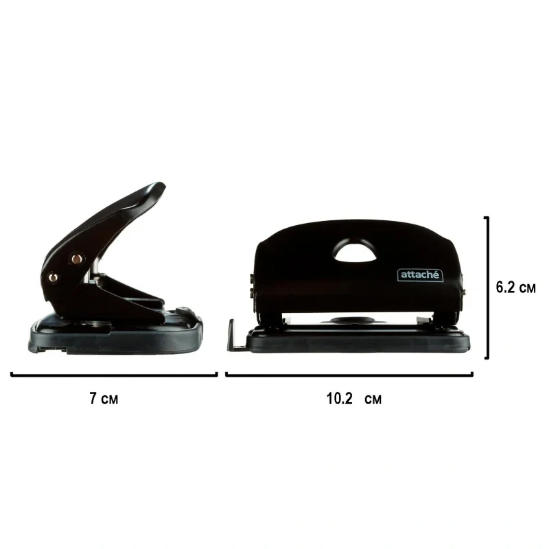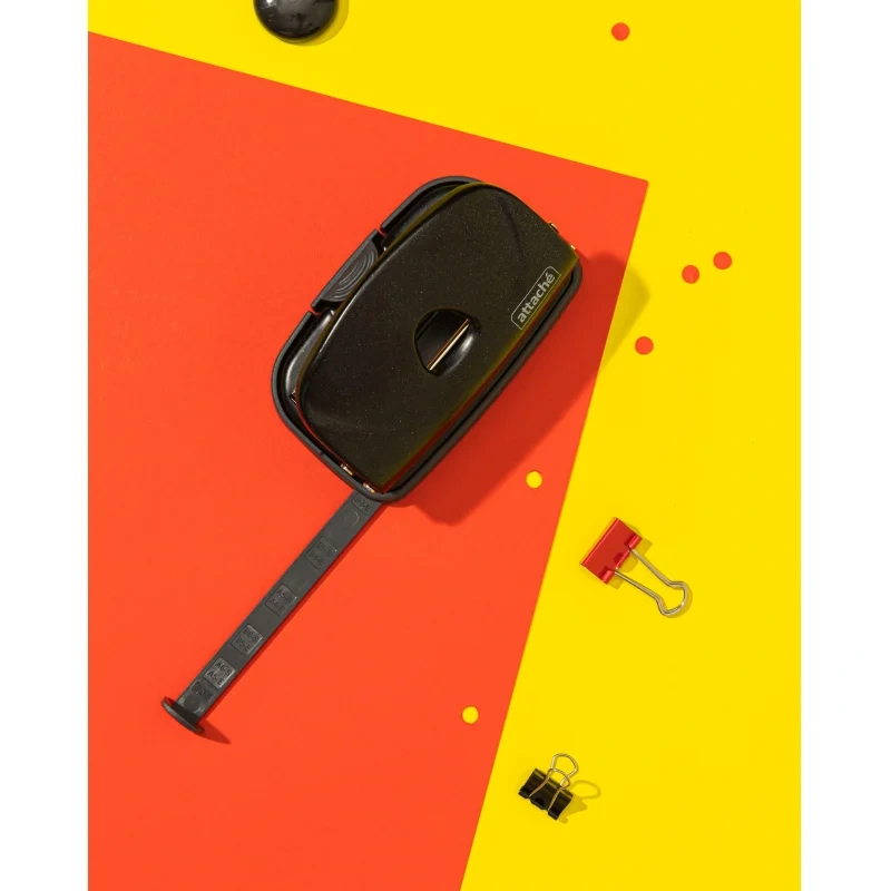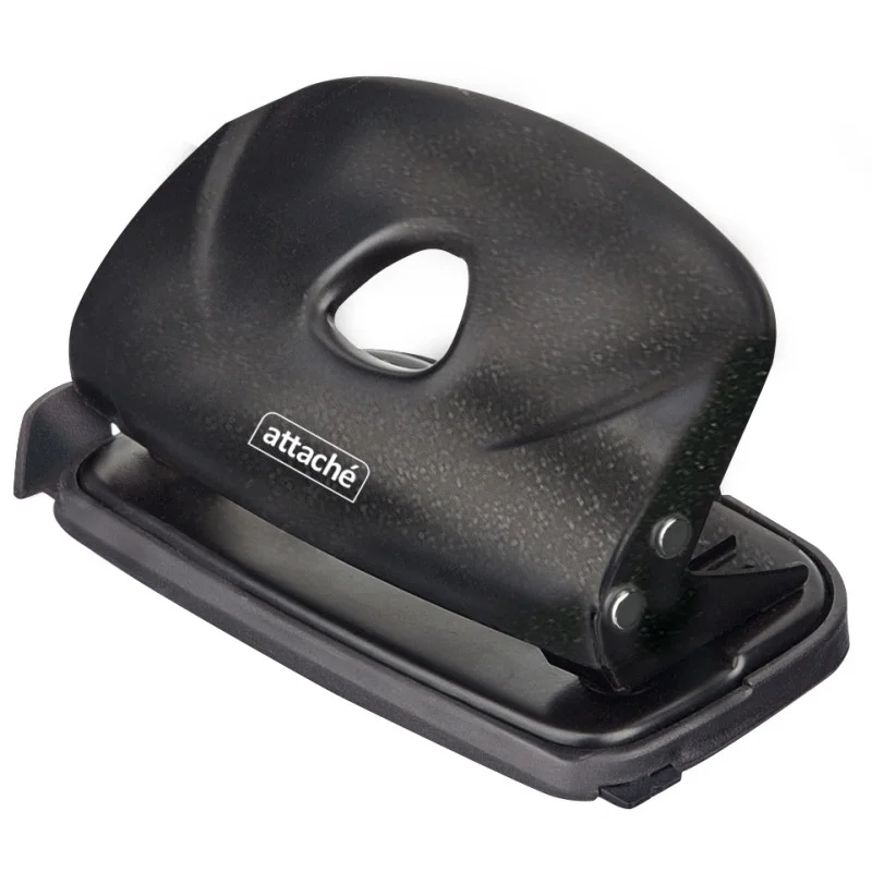 Дырокол Attache Power — это важный и необходимый предмет для комфортной работы в офисе и дома. Дырокол позволяет аккуратно перфорировать документы, чтобы подшить их в папку с двумя и четырьмя кольцами или в скоросшиватель. Стильный дизайн и универсальный черный цвет металлического корпуса подойдут для любого рабочего стола. Одним нажатием возможно пробить отверстия в документе толщиной до 10 листов плотностью 80 г/кв.м. Дырокол делает два отверстия диаметром 6 мм, расстояние между отверстиями — 80 мм. Пробойники дырокола изготовлены из высококачественного металла, что позволит им прослужить дыроколу долго и без сложностей пробивать листы бумаги. Удобный контейнер для конфетти легко открывается и закрывается, исключая его рассыпание. Наличие линейки с делениями позволяет зафиксировать бумагу на нужном расстоянии и пробить отвестия в бумаге в соответствии с ее размером. Удобно работать с форматами A3, А4, А5, А6, B4, B5, B6. Отметка на линейке 888 позволяет производить 4 отверстия. Метка центрирования отсутствует.