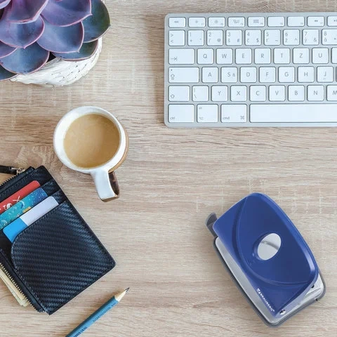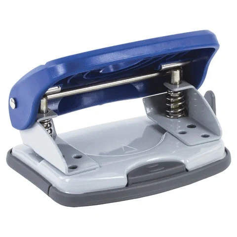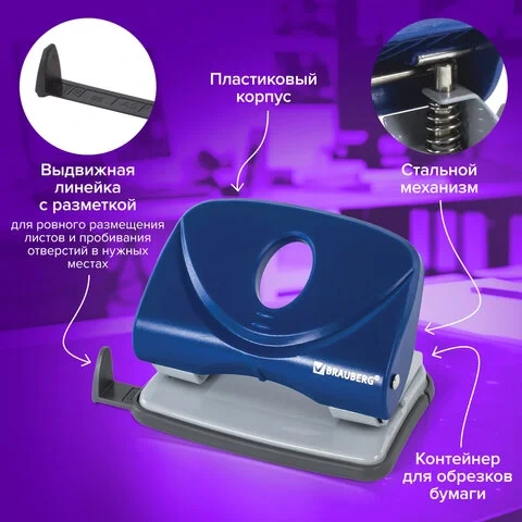 Дырокол эргономичного дизайна пробивает до 20 листов бумаги. Благодаря качественным пробойникам обеспечивает легкое и точное пробивание бумаги. Количество пробиваемых отверстий - 2, диаметр каждого - 6 мм, расстояние между отверстиями - 8 мм. Метка центрирования поможет ровно разместить листы, а ограничительная линейка - пробить отверстия в нужных местах. Благодаря текстурной поверхности дырокола руки не скользят во время работы. Оснащен контейнером для сбора мусора, а также блокиратором для компактного хранения. Классический синий цвет отлично впишется в любой интерьер.