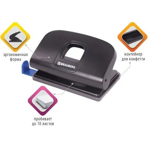 Дырокол BRAUBERG 'Super', до 10 листов, черный, 229090