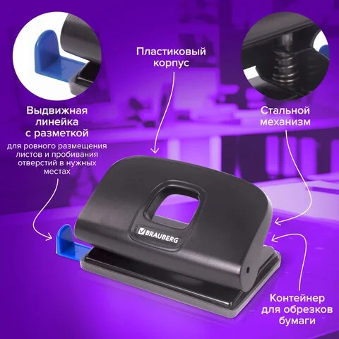Дырокол эргономичного дизайна с металлическим механизмом пробивает до 10 листов бумаги. Благодаря качественным пробойникам обеспечивает легкое и точное пробивание. Количество пробиваемых отверстий - 2, диаметр каждого - 6 мм, расстояние между отверстиями - 8 cм. Метка центрирования поможет ровно разместить листы, а ограничительная линейка - пробить отверстия в нужных местах. Благодаря эргономичной форме поверхности дырокола руки не скользят во время работы. Оснащен контейнером для сбора мусора. Классический черный цвет отлично впишется в любой интерьер.
