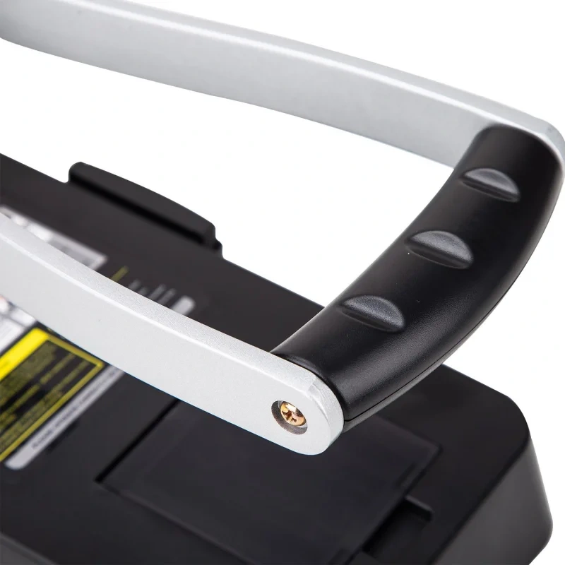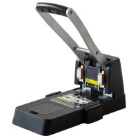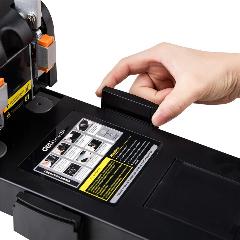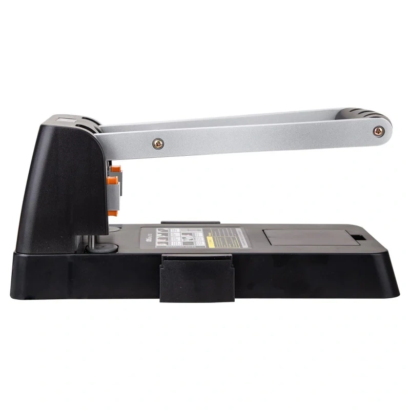 Дырокол металлический мощный с линейкой Deli и с максимальной толщиной сшивания бумаги до 150 листов плотностью 80 г/кв.м., два отверстия диаметром 6 мм. Ручка в виде рычага позволяет пробивать большое количество листов с минимальными усилиями. Снабжен линейкой для настройки форматов бумаги. Дырокол снабжен фиксатором. Цельнометаллический корпус обеспечивает большую долговечность. Имеется вместительный контейнер для конфетти. Размер дырокола 360х195х160 мм. Расстояние между отверстиями: 80 мм. Упакован в картонную коробку. Метка центрирования отсутствует. Для эффективного пробивания максимально допустимого объема бумаги необходимо расположить дырокол на горизонтальной твердой поверхности, прикладывая усилия, плавно надавить на рычаг (при необходимости двумя руками), разномерно распределяя усилия по поверхности рычага.