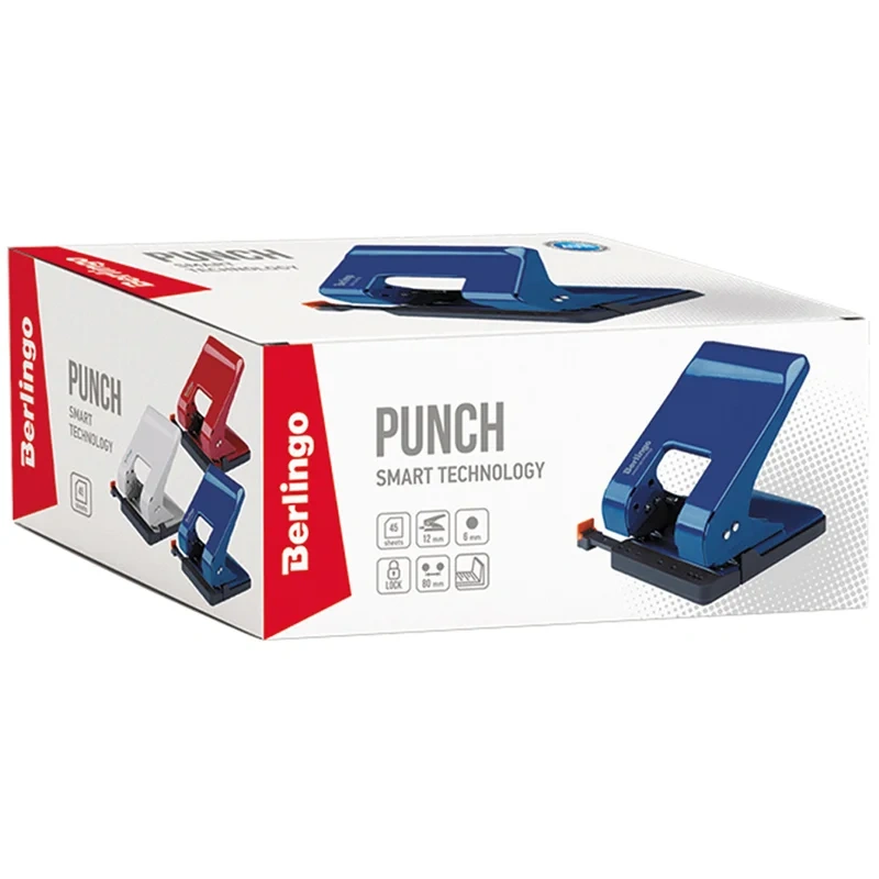 Цельнометаллический ЭНЕРГОСБЕРЕГАЮЩИЙ дырокол Berlingo 'Smart Technology' прекрасно подходит для ежедневного использования. Пробивает до 45 листов.