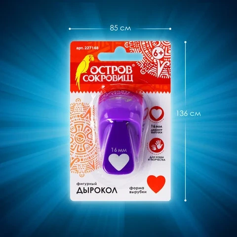 Дырокол фигурный 'Сердце', диаметр вырезной фигуры 16 мм, ОСТРОВ СОКРОВИЩ, 227148