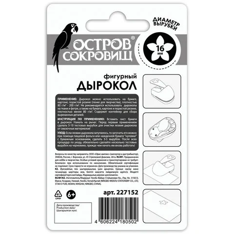 Дырокол компактный и удобный в применении, размер - 6х8,5х13,6 см. Диаметр пробиваемого отверстия - 16 мм, форма вырубки - цветок. Режущие части, изготовленные из высококачественного металла, защищены пластмассовым корпусом, что делает дырокол ОСТРОВ СОКРОВИЩ безопасным для детей. Дыроколом можно работать по бумаге, картону и пористой резине плотностью от 80 до 200 г/м2.