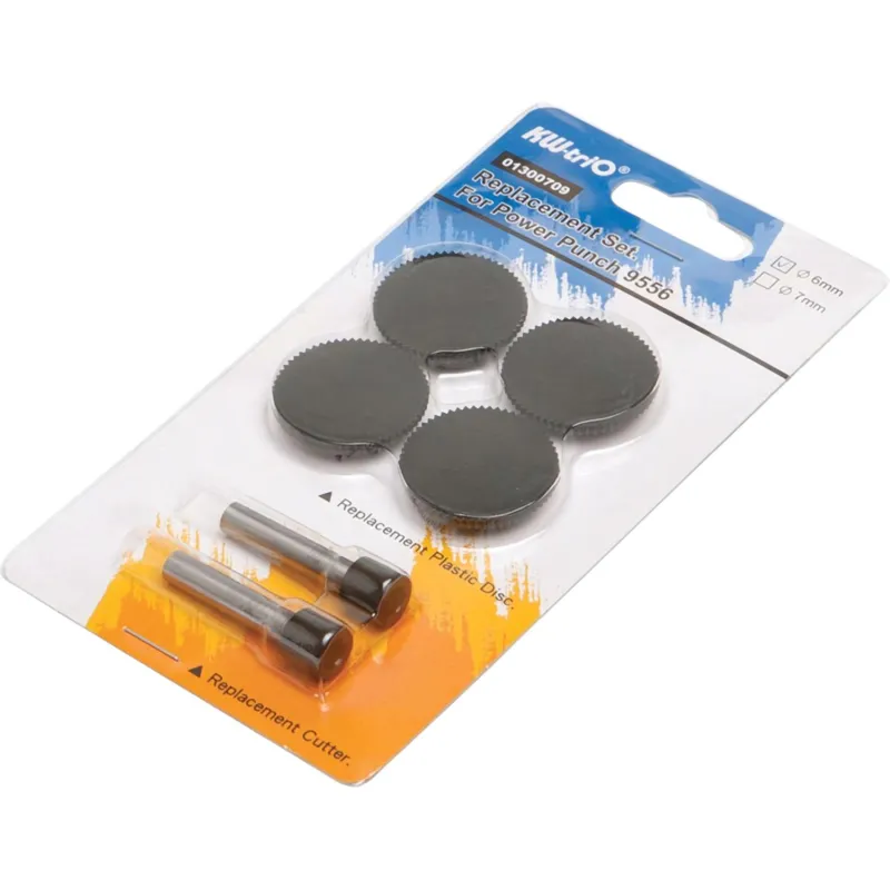 Комплект запасных частей для мощного дырокола KW TRIO LEVER TECH артикул 220348: 2 сменных ножа + 4 сменных пластиковых диска. Диаметр пробиваемого отверстия 6 мм.