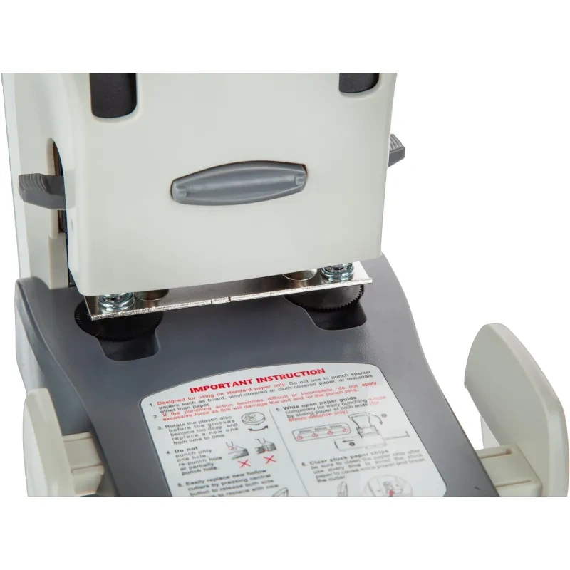Мощный дырокол KW-Trio Lever-Tech HD с экономией до 50% усилий пользователя. Пробивает одновременно до 200 листов 80 г/м2 благодаря механизму с использованием полых режущих элементов. Перфорирует два отверстия диаметром 6 мм, расстояние между отверстиями — 80 мм. В дыроколе предусмотрен отсек для конфетти и выдвижная линейка позволяющая пробивать 4 отверстия в два приема; отделение для хранения сменных ножей и дисков, работающая с форматами А4 и А5, защитный экран. Выполнен в металлическом корпусе серого цвета с пластиковым нескользящим основанием. Быстрая смена ножей и дисков без инструментов (артикул 286649).