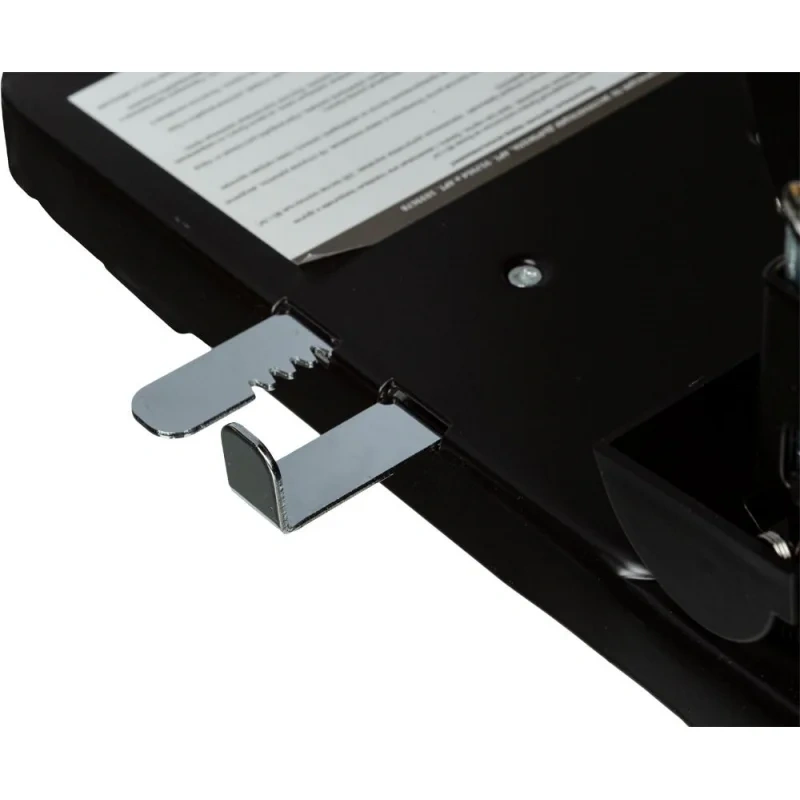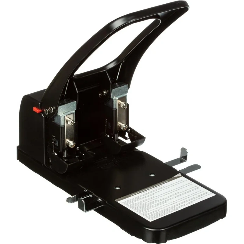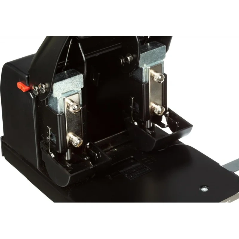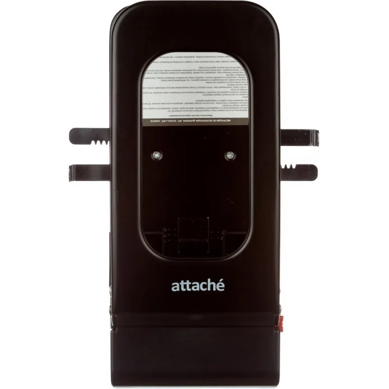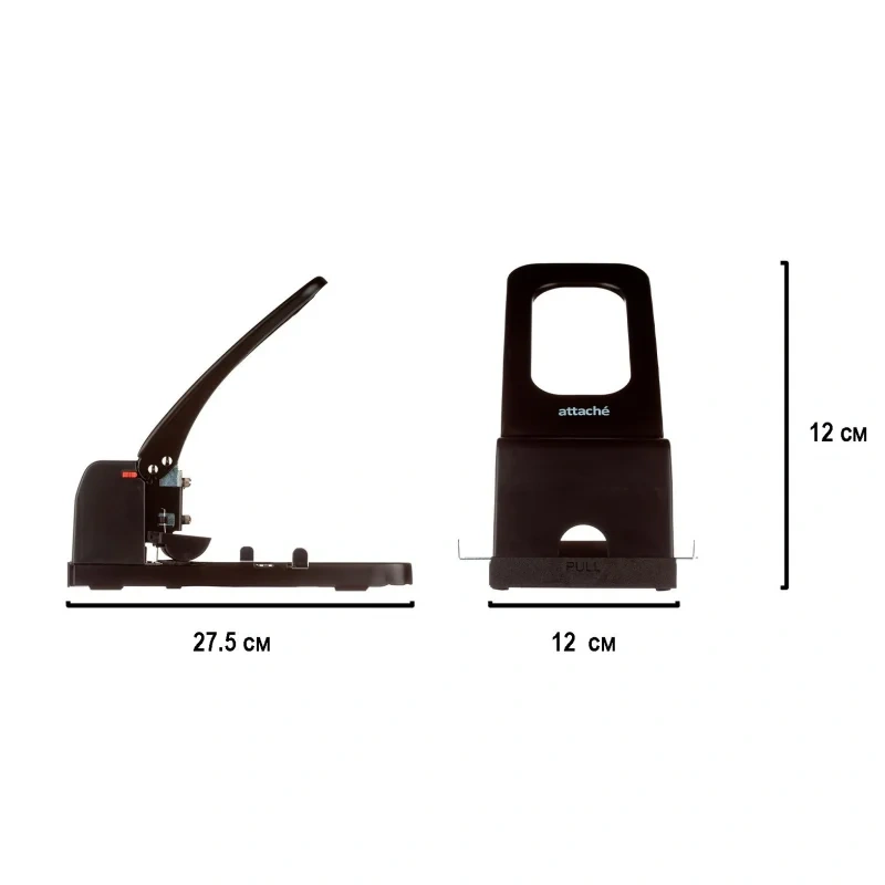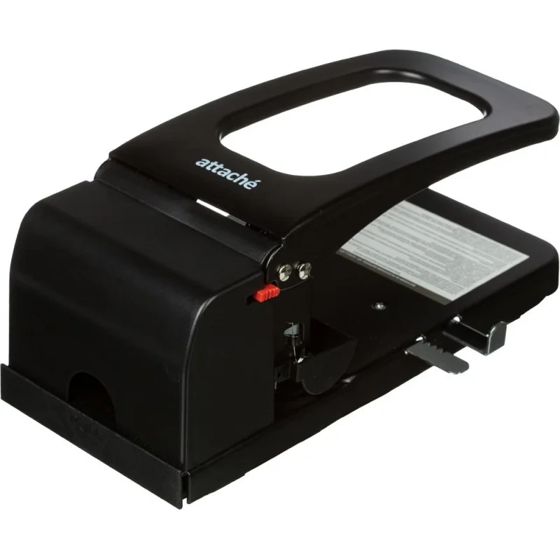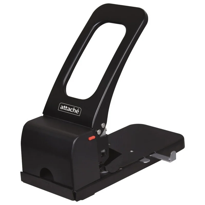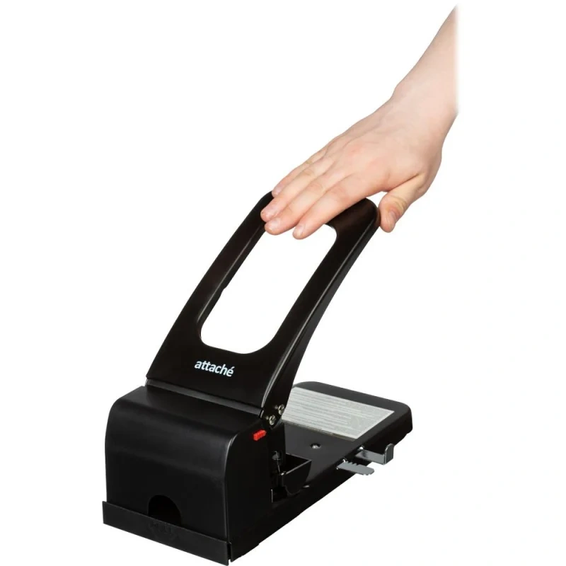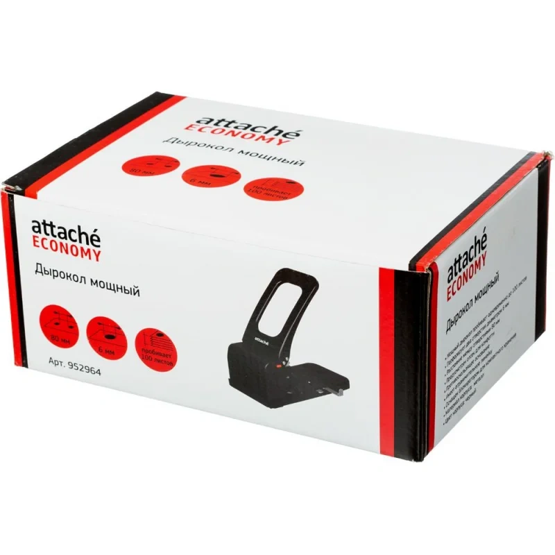 Мощный дырокол Attache (Attache Economy) пробивает одновременно до 100 листов бумаги плотностью 70 г/кв. м и до 85 листов стандартной плотности 80 г/кв. м. Перфорирует два отверстия диаметром 6 мм. Расстояние между отверстиями — 80 мм. В дыроколе предусмотрен отсек для конфетти и выдвижная ограничительная линейка, что позволяет зафиксировать бумагу. Глубина закладки бумаги, регулируемая и варьируется от 6 мм до 12 мм. Дырокол выполнен в металлическом корпусе чёрного цвета с противоскользящим основанием и оснащен фиксатором для компактного хранения. При использовании дырокола диски под ножами изнашиваются, и качество пробивания ухудшается. Для более долговечной работы дисков предусмотрена опция их механического прокручивания. При изнашивании диска в рабочей зоне его необходимо прокрутить до его неиспользованной части. Перед использованием внимательно ознакомьтесь с инструкцией по применению. Не снимайте пластиковые круглые основания под ножами. Имеет метку центрирования. Для начала использования аккуратно нажмите на рукоятку дырокола до упора вниз и переведите красный рычаг блокировки в левое положение. Для эффективного пробивания максимально допустимого объёма бумаги необходимо расположить дырокол на горизонтальной твёрдой поверхности, прикладывая усилия, плавно надавить на рычаг (при необходимости двумя руками), равномерно распределяя усилия по поверхности рычага.