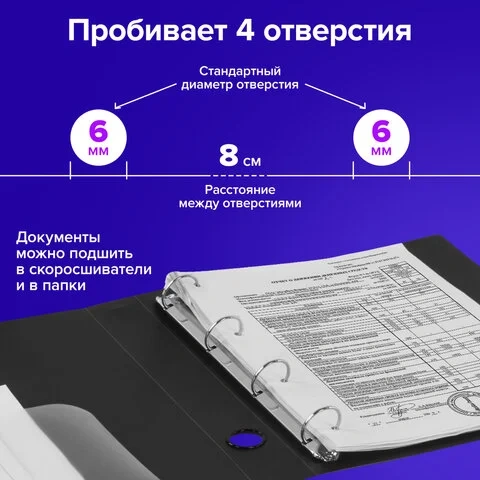 Количество пробиваемых отверстий – 4, диаметр каждого – 6 мм, расстояние между отверстиями – 80 мм. Метка центрирования поможет ровно разместить листы, а ограничительный упор – пробить отверстия в нужных местах.