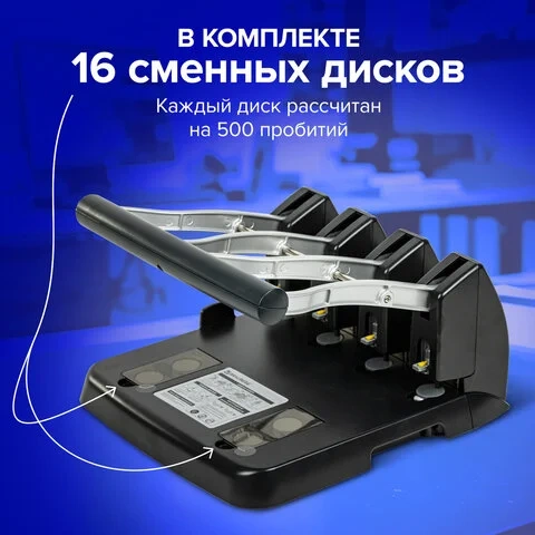 Мощный дырокол пробивает до 150 л. бумаги. Благодаря качественным пробойникам обеспечивает легкое и точное пробивание бумаги.
