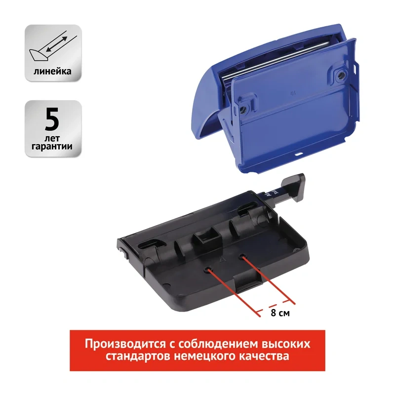 Удобный дырокол для использования в офисе и дома. Изготовлен из высококачественного пластика со съемным контейнером, предохраняющим поверхность стола от царапин. Имеет выдвижную линейку с хорошо читаемой шкалой форматов и надежной фиксацией упора. Расстояние между отверстиями 80мм, диаметр отверстий 5,5мм.