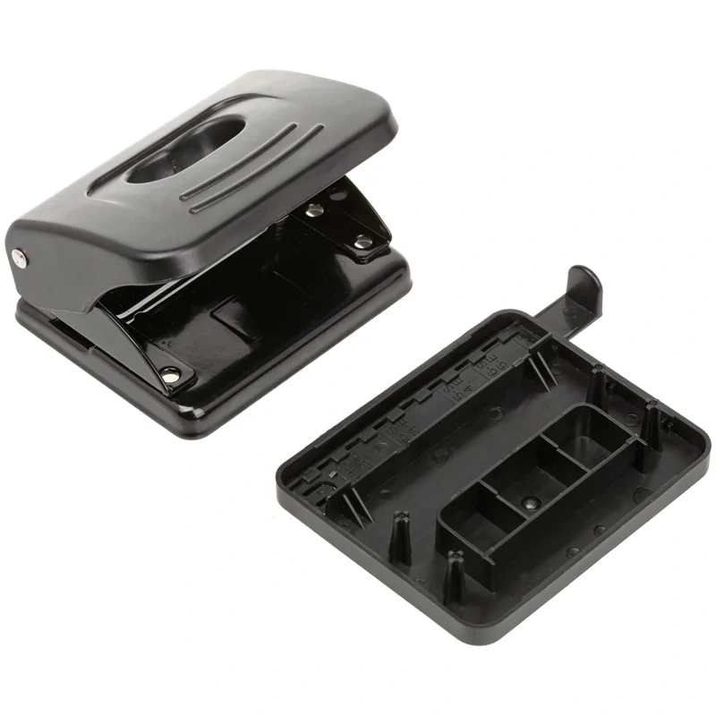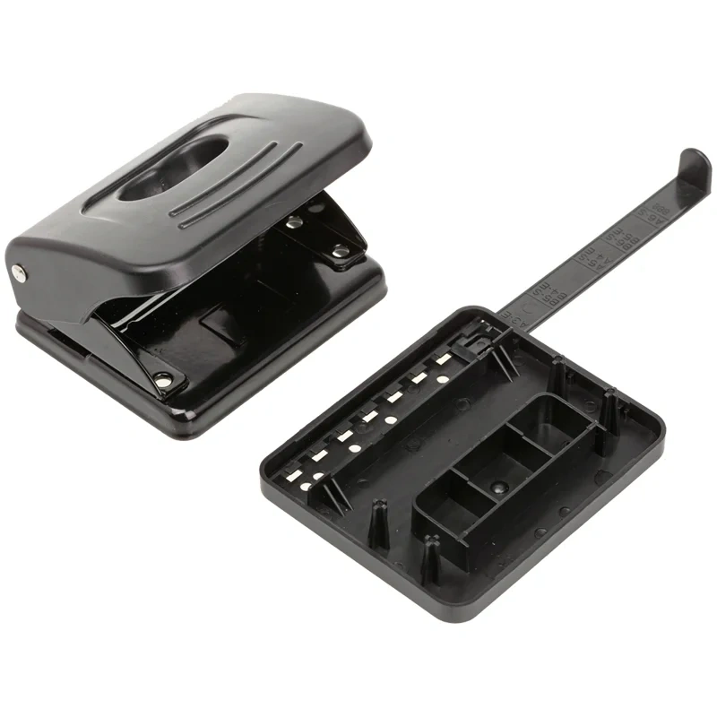 Дырокол пластиковый черный, пробивает до 20 листов, с линейкой