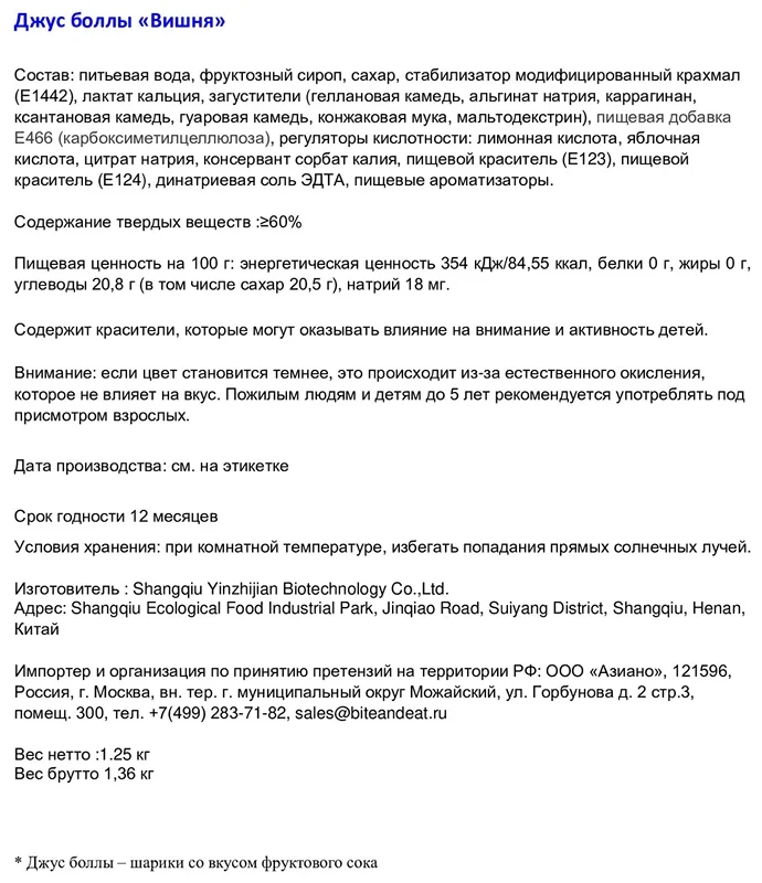 Питьевая вода, фруктозный сироп, сахар, стабилизатор модифицированный крахмал E1442, лактат кальция, загустители геллановая камедь, альгинат натрия, каррагинан, ксантановая камедь, гуаровая камедь, конжаковая мука, мальтодекстрин, пищевая добавка E466 карбоксиметил целлюлоза, регуляторы кислотности: лимонная кислота, яблочная кислота, цитрат натрия, консервант сорбат калия, пищевой краситель E123, пищевой краситель E124, пищевой краситель E133, динатриевая соль ЭДТА, пищевые ароматизаторы.