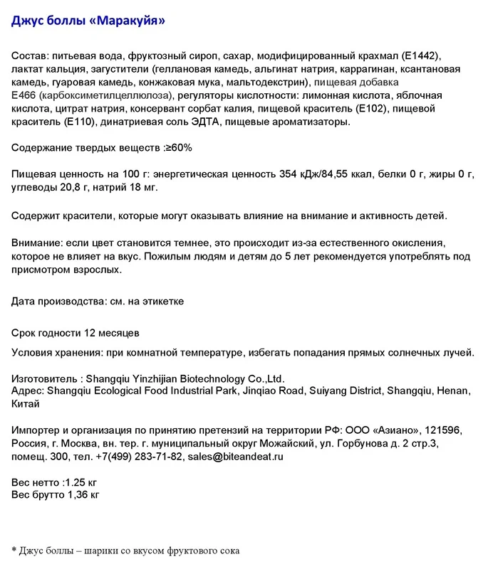 Питьевая вода, фруктозный сироп, сахар, стабилизатор модифицированный крахмал E1442, лактат кальция, загустители геллановая камедь, альгинат натрия, каррагинан, ксантановая камедь, гуаровая камедь, конжаковая мука, мальтодекстрин, пищевая добавка E466 карбоксиметил целлюлоза, регуляторы кислотности: лимонная кислота, яблочная кислота, цитрат натрия, консервант сорбат калия, диоксид титана E171, динатриевая соль ЭДТА, пищевые ароматизаторы.Характеристики
