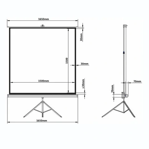 Экран с диагональю 85' и размером 150х150 см имеет черную кайму для улучшения восприятия яркости изображения. Коэффициент отражения составляет 1.0, угол обзора - 160°. Устойчивый штатив круглого сечения для надежности конструкции. Телескопическая штанга и кнопка регулировки для настройки высоты. Удобная ручка для переноски. Возможность легкого отсоединения штатива от корпуса экрана. Наконечники ножек предотвращают скольжение экрана и повреждение пола. Также подходит для крепления к потолку.