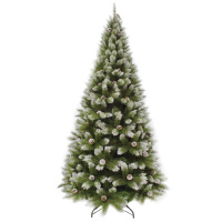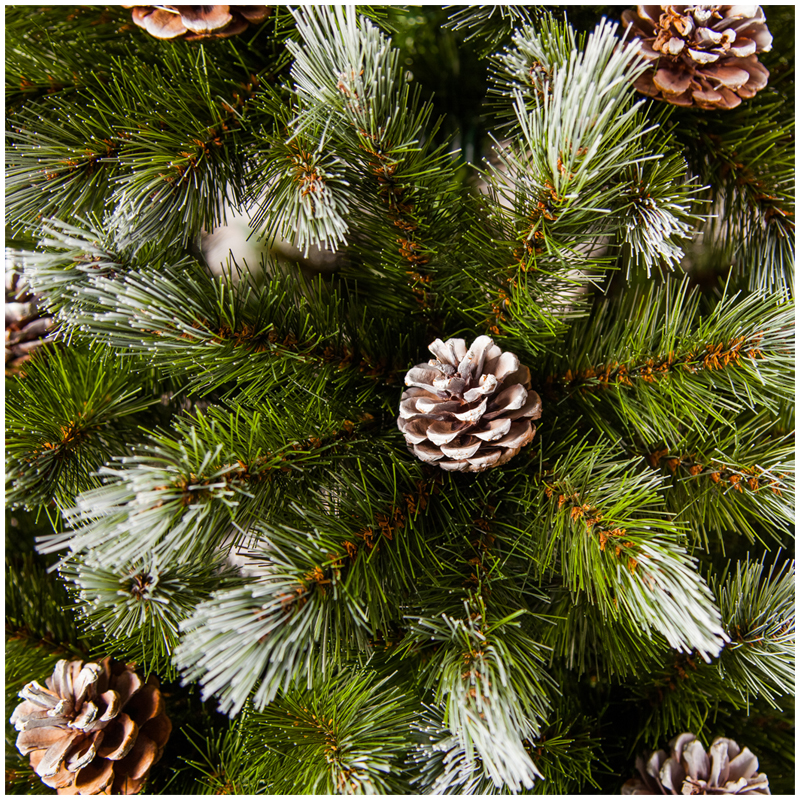 Стройная ель классической треугольной формы. Диаметр нижнего яруса 84 см. Темно-зеленый цвет с заснеженными кончиками. Натуральные шишки. Хвоя леска ПВХ, у основания мягкая хвоя, длина хвоинки от 30 до 35 мм, ветви вставляются в ствол, количество веток 424