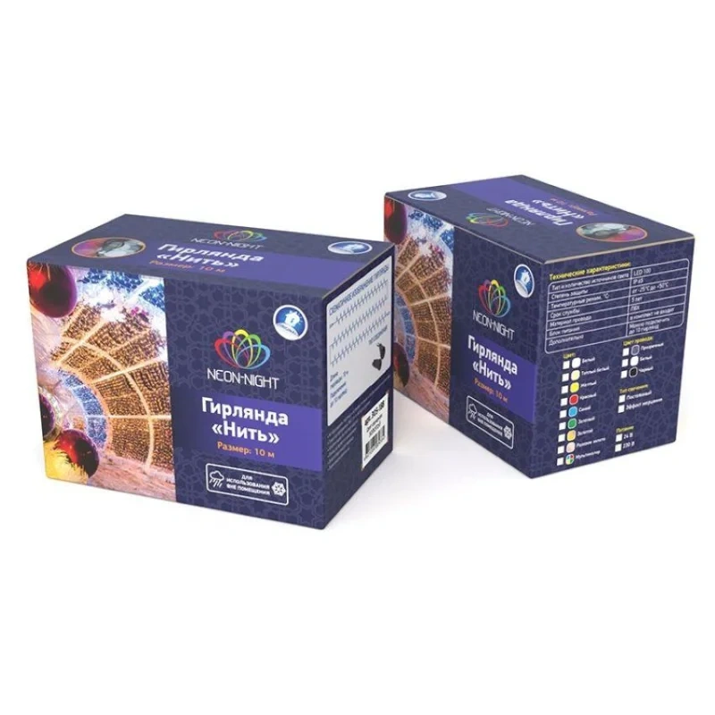 Гирлянда «Нить» представляет собой общий провод с последовательно расположенными коротенькими отводами, направленными в разные стороны. На концах этих «отростков» расположены яркие светодиоды. Общая длина гирлянды составляет 10 метров. «Нить» является наиболее универсальной из всех гирлянд и используется для украшения как уличных, так и домашних елей, для оформления различных витрин, окон, колонн, элементов интерьера и разнообразных композиций. Часто «Нити» используются под различные проекты по украшению объектов различной значимости благодаря тому, что может соединяться до 50 метров при подключении на шнур питания 303-500-1 (в комплект не входит). Данная гирлянда имеет прозрачный ПВХ и синий цвет свечения светодиодов. Её особенностью является наличие мерцающих светодиодов белого цвета, которые привлекают внимание и значительно преображают украшенную поверхность (мерцает каждый пятый светодиод). Гирлянда предназначена для использования как внутри помещения, так и снаружи.